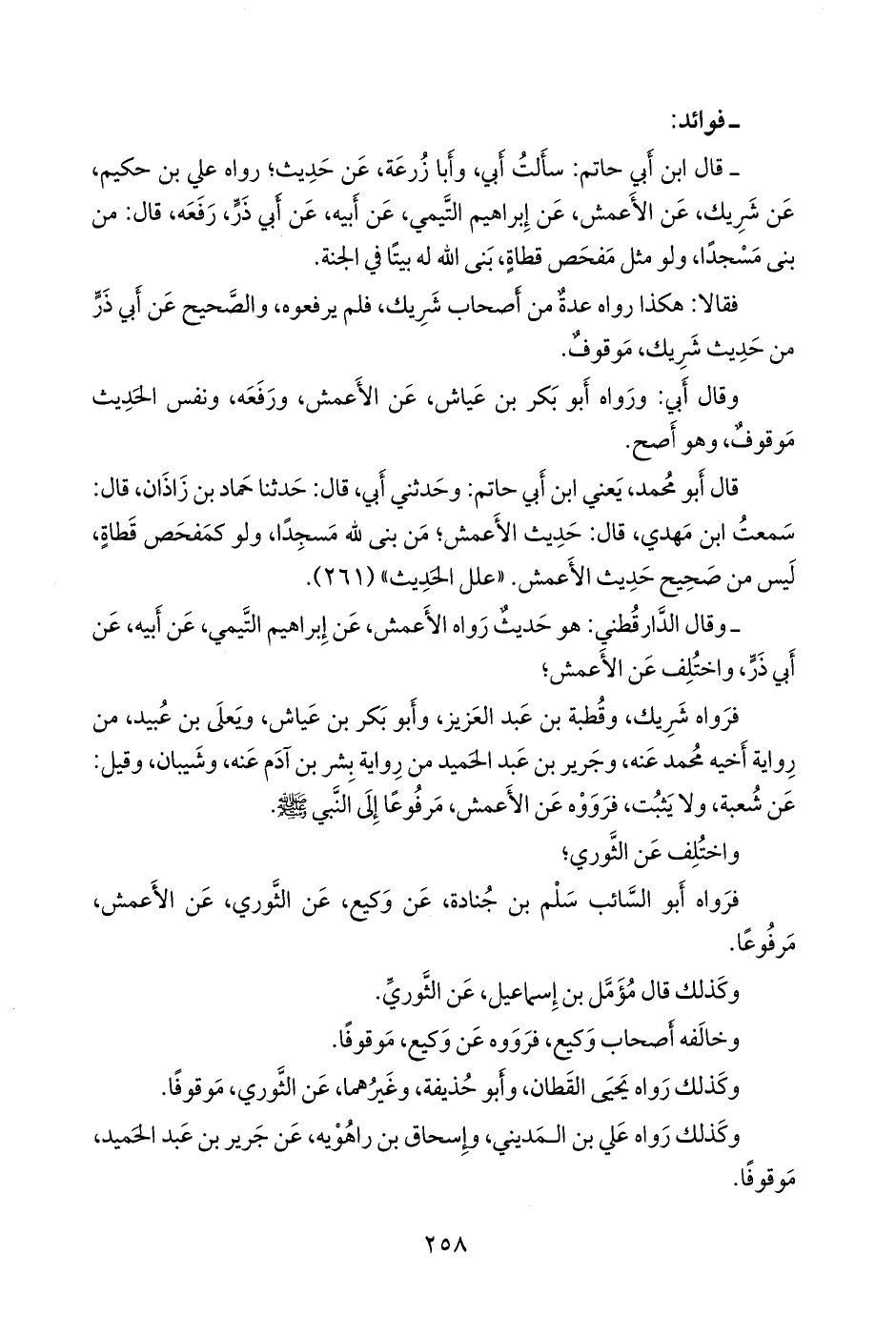 - قال عبد الرَّحمَن بن أبي حاتم الرازي: سألت أبي، وأَبا زُرعَة، عن حديث؛ رواه علي بن حكيم، عن شريك، عن الأعمش، عن إبراهيم التيمي، عن أبيه، عن أبي ذر، رفعه، قال: من بنى مسجدا، ولو مثل مفحص قطاة، بنى الله له بيتا في الجنة.