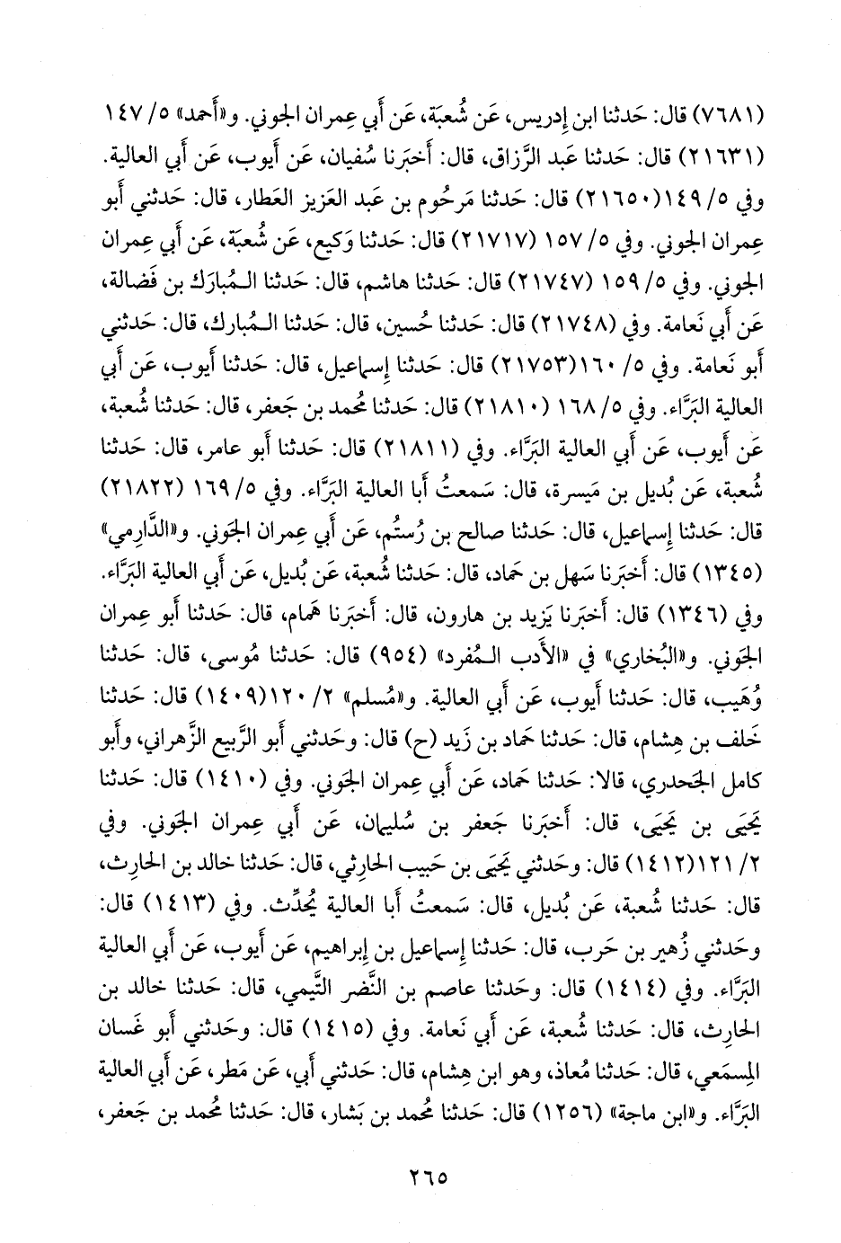 و «أحمد» (٢١٦٣١) قال: حدثنا عبد الرزاق، قال: أخبرنا سفيان، عن أيوب، عن أبي العالية. وفي (٢١٦٥٠) قال: حدثنا مرحوم بن عبد العزيز العطار، قال: حدثني أَبو عمران الجَوني. وفي (٢١٧١٧) قال: حدثنا وكيع، عن شعبة، عن أبي عمران الجَوني. وفي (٢١٧٤٧) قال: حدثنا هاشم، قال: حدثنا المبارك بن فضالة، عن أبي نَعامة. وفي (٢١٧٤٨) قال: حدثنا حسين، قال: حدثنا المبارك، قال: حدثني أَبو نَعامة. وفي (٢١٧٥٣) قال: حدثنا إسماعيل، قال: حدثنا أيوب، عن أبي العالية البَرَّاء. وفي (٢١٨١٠) قال: حدثنا محمد بن جعفر، قال: حدثنا شعبة، عن أيوب، عن أبي العالية البَرَّاء. وفي (٢١٨١١) قال: حدثنا أَبو عامر، قال: حدثنا شعبة، عن بديل بن ميسرة، قال: سمعت أبا العالية البَرَّاء. وفي (٢١٨٢٢) قال: حدثنا إسماعيل، قال: حدثنا صالح ابن رستم، عن أبي عمران الجَوني. و «الدَّارِمي» (١٣٤٥) قال: أخبرنا سهل بن حماد، قال: حدثنا شعبة، عن بديل، عن أبي العالية البَرَّاء. وفي (١٣٤٦) قال: أخبرنا يزيد بن هارون، قال: أخبرنا همام، قال: حدثنا أَبو عمران الجَوني. و «البخاري» في «الأدب المفرد» (٩٥٤) قال: حدثنا موسى، قال: حدثنا وهيب، قال: حدثنا أيوب، عن أبي العالية. و «مسلم» ٢/ ١٢٠ (١٤٠٩) قال: حدثنا خلف ابن هشام، قال: حدثنا حماد بن زيد (ح) قال: وحدثني أَبو الربيع الزهراني، وأَبو كامل الجَحدري، قالا: حدثنا حماد، عن أبي عمران الجَوني. وفي (١٤١٠) قال: حدثنا يحيى بن يحيى، قال: أخبرنا جعفر بن سليمان، عن أبي عمران الجَوني. وفي ٢/ ١٢١ (١٤١٢) قال: وحدثني يحيى بن حبيب الحارثي، قال: حدثنا خالد بن الحارث، قال: حدثنا شعبة، عن بديل، قال: سمعت أبا العالية يحدث. وفي (١٤١٣) قال: وحدثني زهير بن حرب، قال: حدثنا إسماعيل بن إبراهيم، عن أيوب، عن أبي العالية البَرَّاء. وفي (١٤١٥) قال: وحدثني أَبو غسان المسمعي، قال: حدثنا معاذ، وهو ابن هشام، قال: حدثني أبي، عن مطر، عن أبي العالية البَرَّاء. و «ابن ماجة» (١٢٥٦) قال: حدثنا محمد بن بشار، قال: حدثنا محمد بن جعفر،