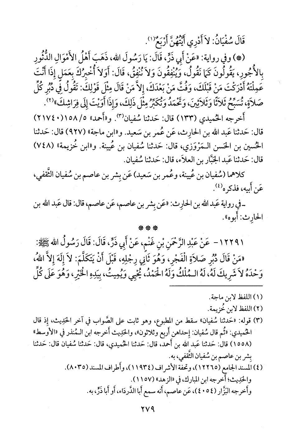 (¬١) قوله: «حدثنا سفيان» سقط من المطبوع، وهو ثابت على الصواب في نسخة الظاهرية الخطية، الورقة (١٧/ ب)، وكذلك في آخر الحديث، إذ قال الحميدي: «ثم قال سفيان: إحداهن أربع وثلاثون»، والحديث أخرجه ابن المنذر في «الأوسط» (١٥٥٨) قال: حدثنا عبد الله بن أحمد، قال: حدثنا الحميدي، قال: حدثنا سفيان قال: حدثنا بشر بن عاصم بن سفيان الثقفي، به.