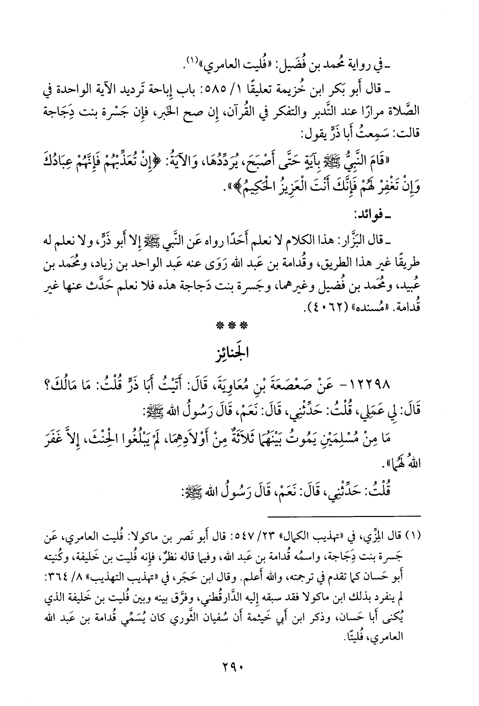 - قال البزار: هذا الكلام لا نعلم أحدًا رواه عن النبي صَلى الله عَليه وسَلم إلا أَبو ذر، ولا نعلم له طريقا غير هذا الطريق، وقدامة بن عبد الله روى عنه عبد الواحد بن زياد، ومحمد بن عبيد، ومحمد بن فضيل وغيرهما، وجَسْرة بنت دِجاجة هذه فلا نعلم حدث عنها غير قدامة. «مسنده» (٤٠٦٢).