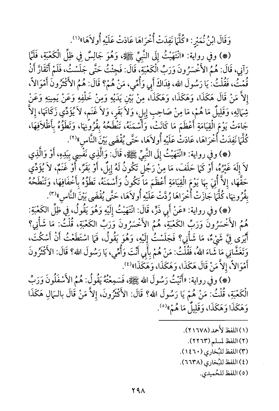 - وفي رواية: «عن أبي ذر، قال: انتهيت إليه وهو يقول، في ظل الكعبة: هم الأخسرون ورب الكعبة، هم الأخسرون ورب الكعبة، قلت: ما شأني؟ أيرى في شيء، ما شأني؟ فجلست إليه، وهو يقول، فما استطعت أن أسكت، وتغشاني ما شاء الله، فقلت: من هم بأبي أنت وأمي، يا رسول الله؟ قال: الأكثرون أموالا، إلا من قال هكذا، وهكذا، وهكذا» (¬٢).