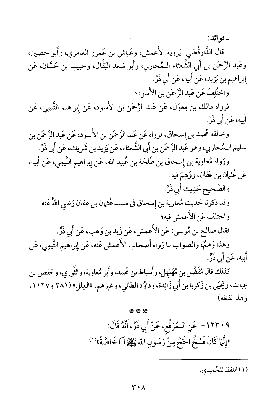 - وفي رواية: «عن المُرَقِّع, عن أبي ذر، قال: ليس لأحد أن يهل بالحج، ثم يجعلها عمرة، إلا للركب الذين كانوا مع النبي صَلى الله عَليه وسَلم».