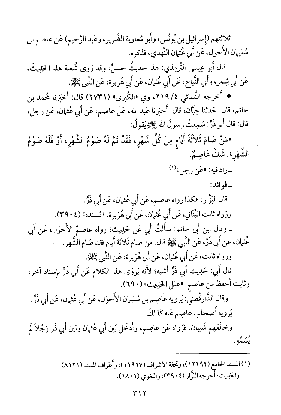 - وقال ابن أبي حاتم: سألتُ أبي عن حديثٍ؛ رواه عاصم الأحول، عن أبي عثمان، عن أبي ذر، عن النبي صَلى الله عَليه وسَلم قال: من صام ثلاثة أيام فقد صام الشهر.