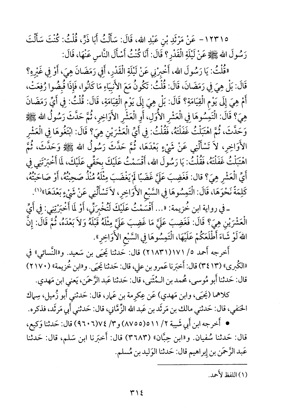 ١٢٣١٥ - عن مَرثد بن عبد الله، قال: سألتُ أَبا ذر، قلت: كنت سألت رسول الله صَلى الله عَليه وسَلم عن ليلة القدر؟ قال: أنا كنت أسأل الناس عنها، قال: