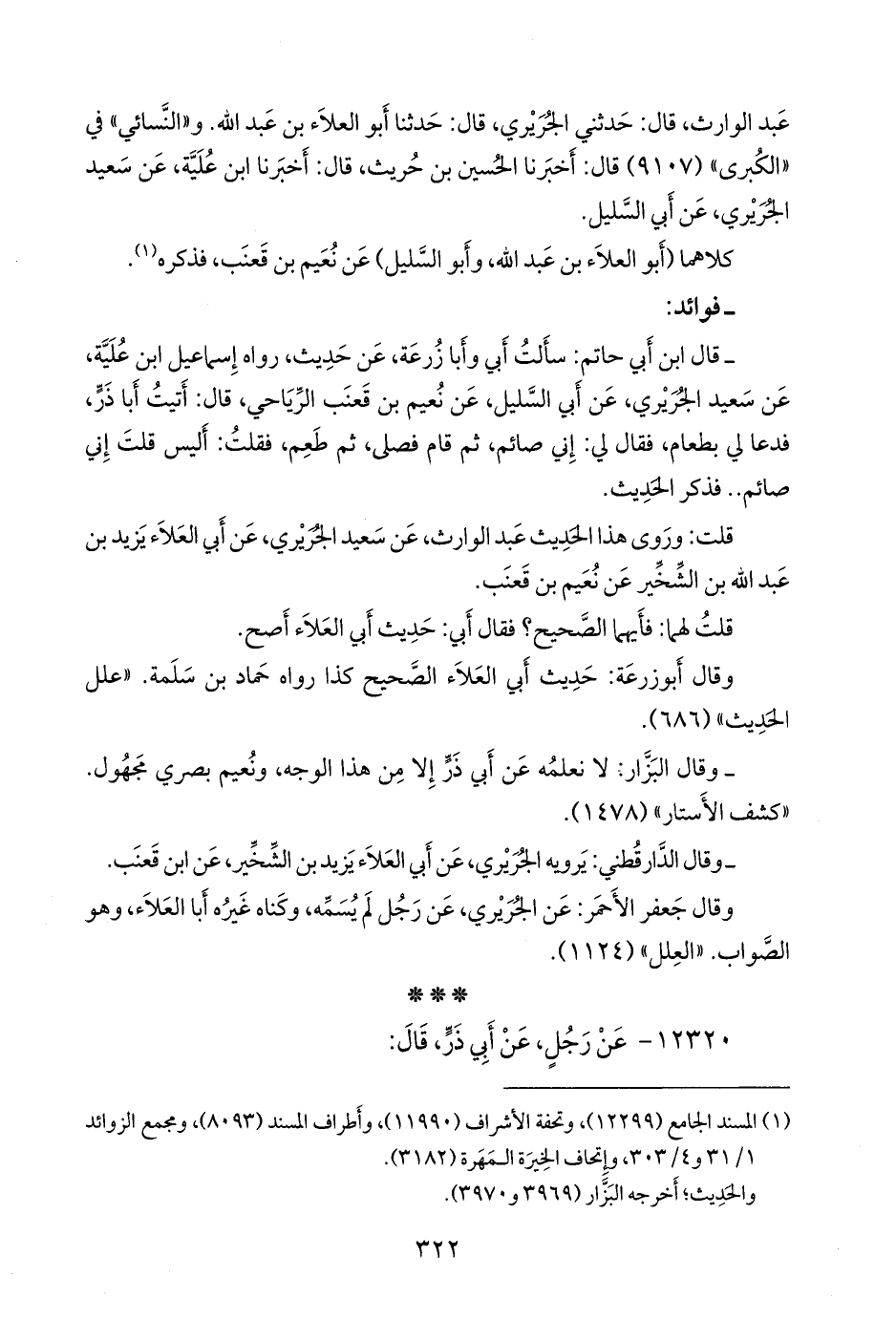 - قال عبد الرَّحمَن بن أبي حاتم الرازي: سألت أبي وأَبا زُرعَة، عن حديث، رواه إسماعيل ابن عُلَية، عن سعيد الجُريري، عن أبي السَّليل، عن نعيم بن قعنب الرياحي، قال: أتيت أبا ذر، فدعا لي بطعام، فقال لي: إني صائم، ثم قام فصلى، ثم طعم، فقلت: أليس قلت إني صائم .. فذكر الحديث.