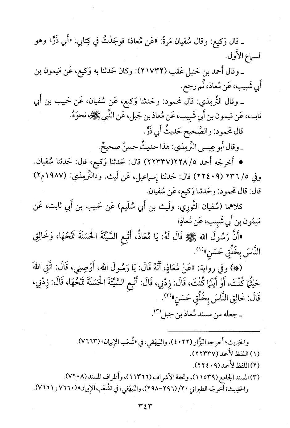 «أن النبي صَلى الله عَليه وسَلم قال: يا معاذ، وقد قال وكيع بأخرة: يا أبا ذر ـ أتبع السيئة الحسنة تمحها, وخالق الناس خلقا حسنا»، «مُرسَل».