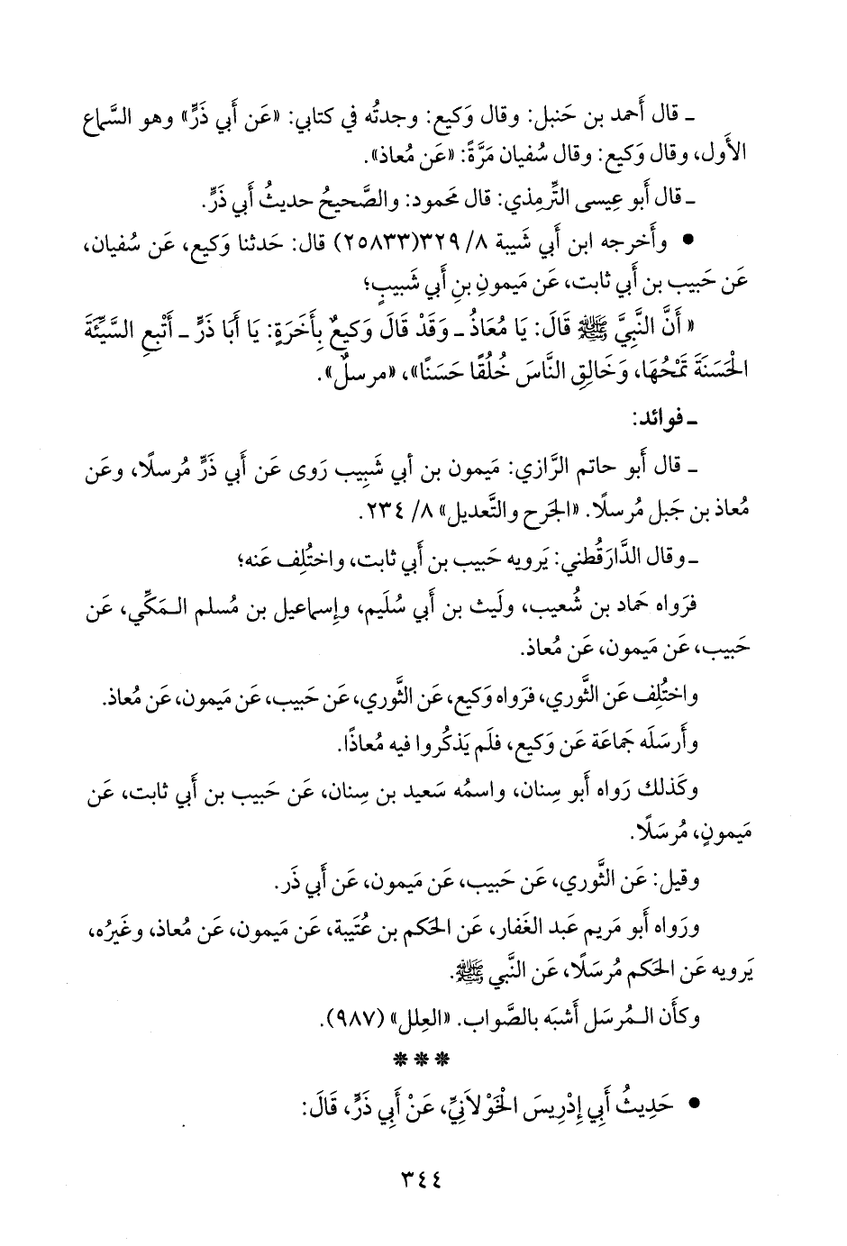 - قلنا: إِسناده ضعيفٌ؛ قال أَبو حاتم الرازي: ميمون بن أبي شبيب روى عن أبي ذر مرسلا، وعن معاذ بن جبل مُرسلًا. «الجرح والتعديل» ٨/ ٢٣٤.