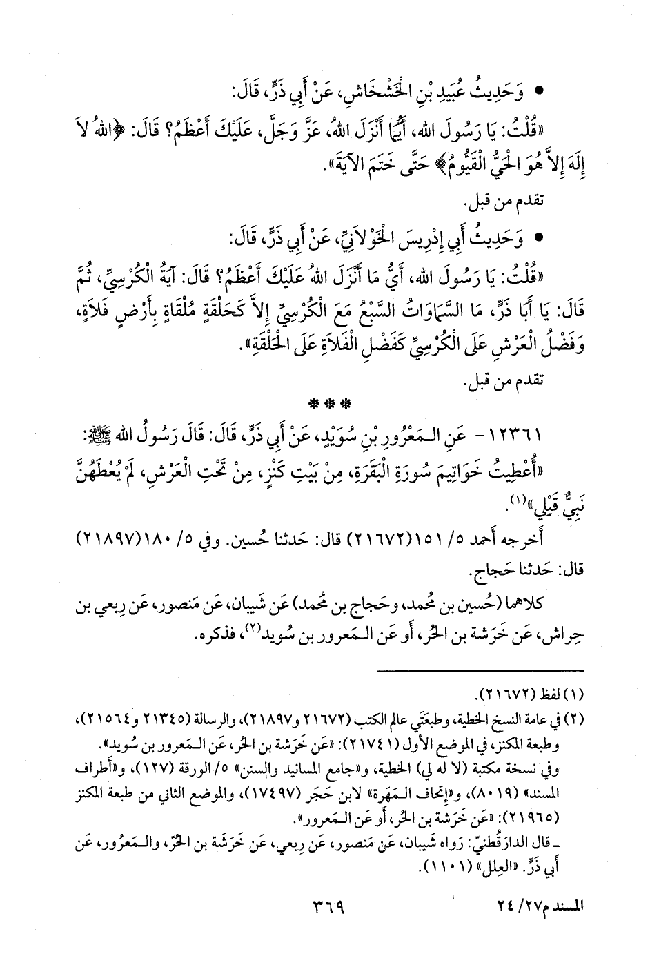 (¬٢) في عامة النسخ الخطية، وطبعتي عالم الكتب (٢١٦٧٢ و ٢١٨٩٧)، والرسالة (٢١٣٤٥ و ٢١٥٦٤)، وطبعة المكنز، في الموضع الأول (٢١٧٤١): «عن خرشة بن الحر، عن المعرور بن سويد».