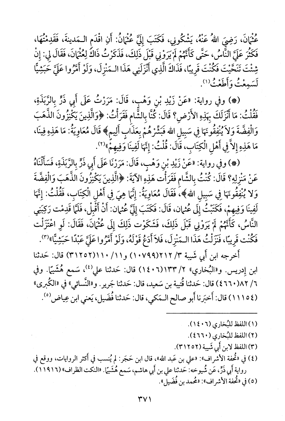 - وفي رواية: «عن زيد بن وهب، قال: مررنا على أبي ذر بالربذة، فسألناه عن منزله؟ قال: كنت بالشام فقرأت هذه الآية: {الذين يكنزون الذهب والفضة ولا ينفقونها في سبيل الله}، فقال معاوية: إنما هي في أهل الكتاب، فقلت: إنها لفينا وفيهم، فكتبت إلى عثمان، قال: فكتب إلي عثمان: أن أقبل، فلما قدمت ركبني الناس، كأنهم لم يروني قبل ذلك، فشكوت ذلك إلى عثمان، فقال: لو اعتزلت فكنت قريبا، فنزلت هذا المنزل، فلا أدع قوله، ولو أمروا علي عبدًا حبشيا» (¬١).