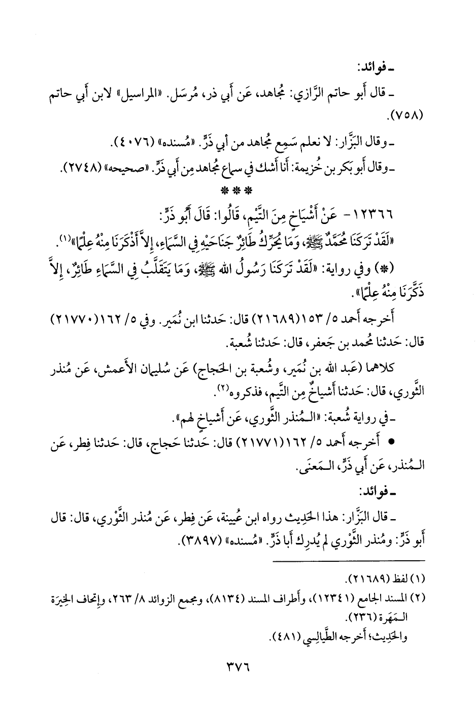 - قال البزار: هذا الحديث رواه ابن عُيينة، عن فطر، عن منذر الثوري، قال: قال أَبو ذر: ومنذر الثوري لم يدرك أبا ذر. «مسنده» (٣٨٩٧)