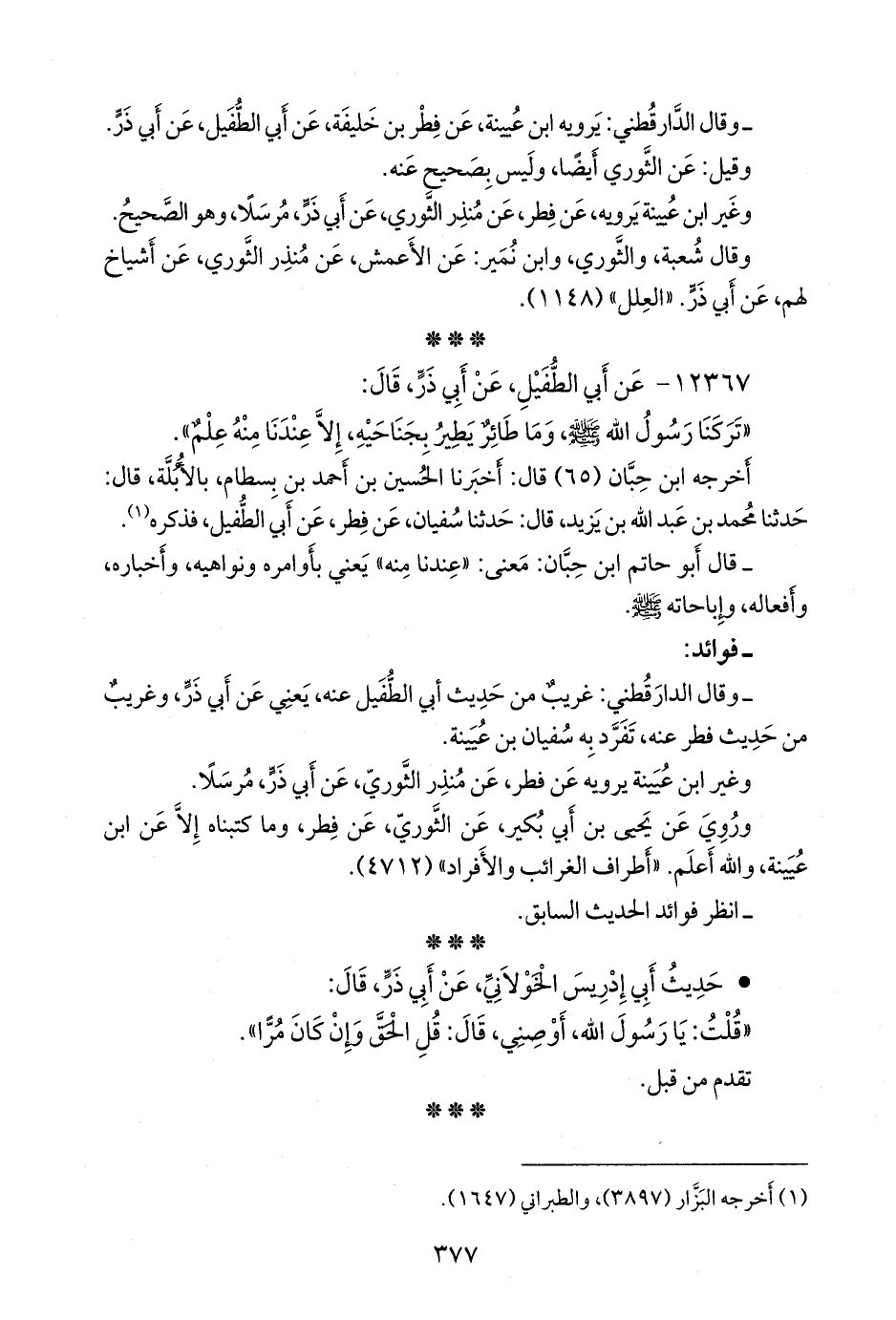 - وقال الدارقُطني: غريبٌ من حديث أبي الطفيل عنه، يعني عن أبي ذر، وغريب من حديث فطر عنه، تفرد به سفيان بن عُيينة.