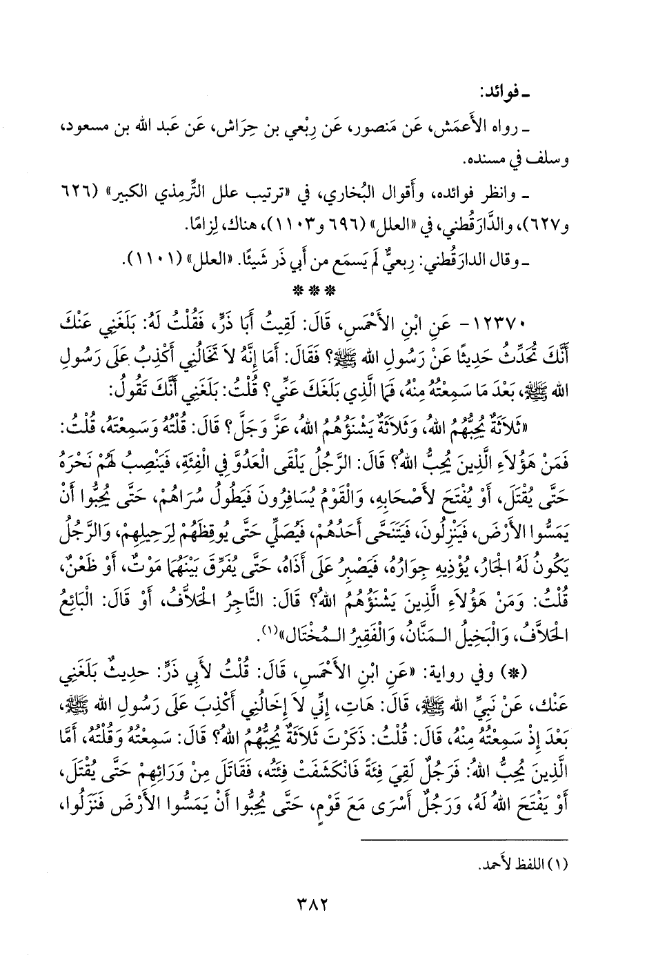 - وفي رواية: «عن ابن الأحمس قال: قلت لأبي ذر: حديث بلغني عنك، تحدثه عن النبي صَلى الله عَليه وسَلم؟ قال: سمعته منه وقلته، فذكر: ثلاثة يشنؤهم الله: البخيل، والمنان، والمختال» (¬٢).