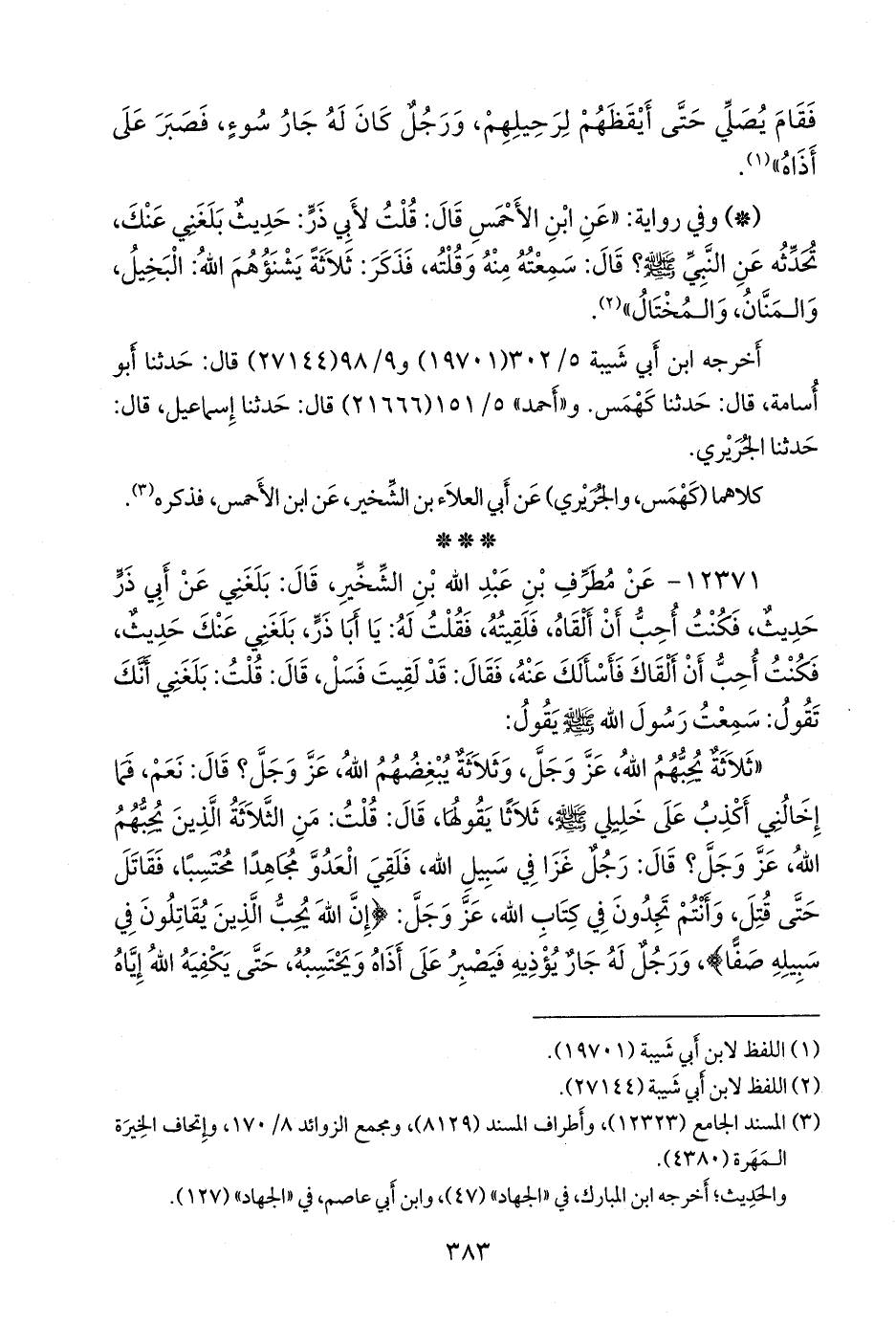 «ثلاثة يحبهم الله، عز وجل، وثلاثة يبغضهم الله، عز وجل؟ قال: نعم، فما إخالني أكذب على خليلي صَلى الله عَليه وسَلم ثلاثا يقولها، قال: قلت: من الثلاثة الذين يحبهم الله، عز وجل؟ قال: رجل غزا في سبيل الله، فلقي العدو مجاهدا محتسبا، فقاتل حتى قتل، وأنتم تجدون في كتاب الله، عز وجل: {إن الله يحب الذين يقاتلون في سبيله صفا}، ورجل له جار يؤذيه فيصبر على أذاه ويحتسبه، حتى يكفيه الله إياه