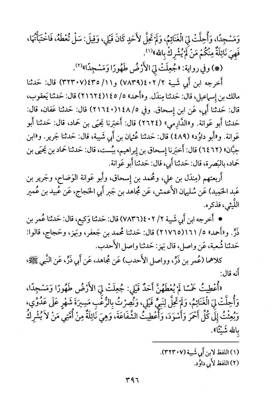 «أعطيت خمسا لم يعطهن أحد قبلي: جعلت لي الأرض طهورا ومسجدا، وأحلت لي الغنائم، ولم تحل لنبي قبلي، ونصرت بالرعب مسيرة شهر على عدوي، وبعثت إلى كل أحمر وأسود، وأعطيت الشفاعة، وهي نائلة من أمتي من لا يشرك بالله شيئا»