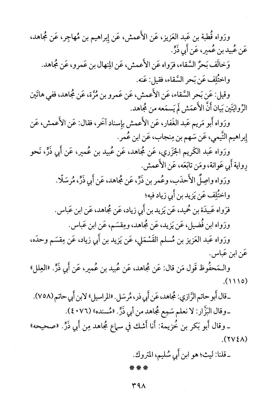 - قال أَبو حاتم الرازي: مجاهد، عن أبي ذر، مرسل. «المراسيل» لابن أبي حاتم (٧٥٨).