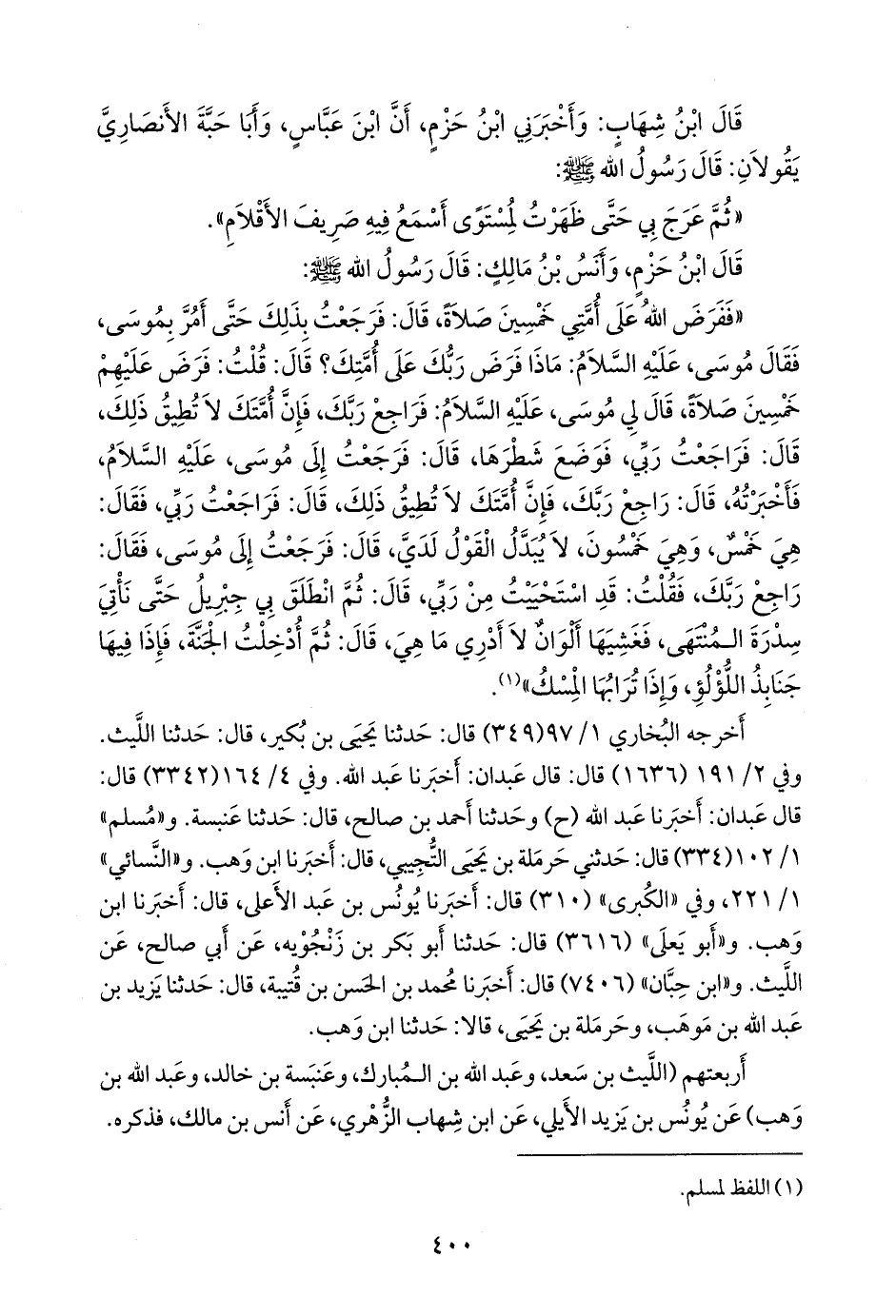 «ففرض الله على أمتي خمسين صلاة، قال: فرجعت بذلك حتى أمر بموسى، فقال موسى، عليه السلام: ماذا فرض ربك على أمتك؟ قال: قلت: فرض عليهم خمسين صلاة، قال لي موسى، عليه السلام: فراجع ربك، فإن أمتك لا تطيق ذلك، قال: فراجعت ربي، فوضع شطرها، قال: فرجعت إلى موسى، عليه السلام، فأخبرته، قال: راجع ربك، فإن أمتك لا تطيق ذلك، قال: فراجعت ربي، فقال: هي خمس، وهي خمسون، لا يبدل القول لدي، قال: فرجعت إلى موسى، فقال: راجع ربك، فقلت: قد استحييت من ربي، قال: ثم انطلق بي جبريل حتى نأتي سدرة المنتهى، فغشيها ألوان لا أدري ما هي، قال: ثم أدخلت الجنة، فإذا فيها جنابذ اللؤلؤ، وإذا ترابها المسك» (¬١).