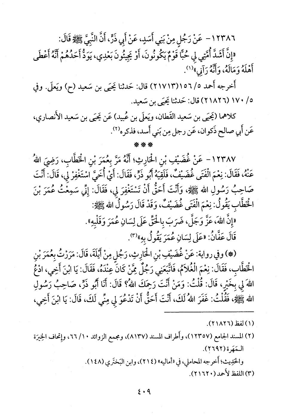 ١٢٣٨٧ - عن غضيف بن الحارث؛ أنه مر بعمر بن الخطاب، رضي الله عنه، فقال: نعم الفتى غضيف، فلقيه أَبو ذر، فقال: أي أخي استغفر لي، قال: أنت صاحب رسول الله صَلى الله عَليه وسَلم وأنت أحق أن تستغفر لي، فقال: إني سمعت عمر بن الخطاب يقول: نعم الفتى غضيف، وقد قال رسول الله صَلى الله عَليه وسَلم: