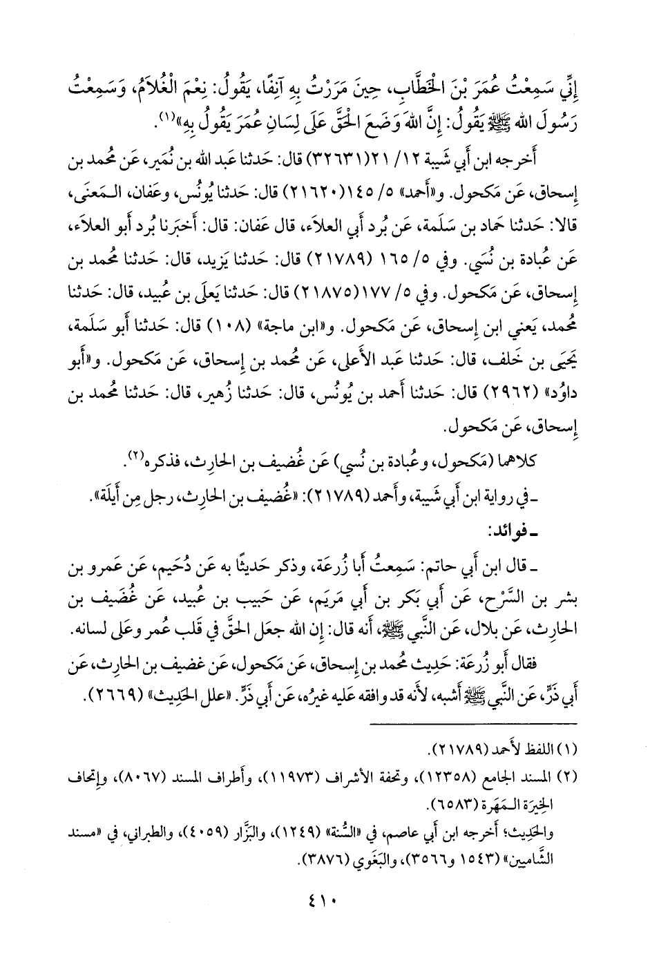- قال عبد الرَّحمَن بن أبي حاتم الرازي: سمعت أَبا زُرعَة، وذكر حديثا به عن دُحَيم، عن عَمرو بن بشر بن السَّرح، عن أَبي بكر بن أبي مريم، عن حبيب بن عبيد، عن غضيف بن الحارث، عن بلال، عن النبي صَلى الله عَليه وسَلم أنه قال: إن الله جعل الحق في قلب عمر وعلى لسانه.