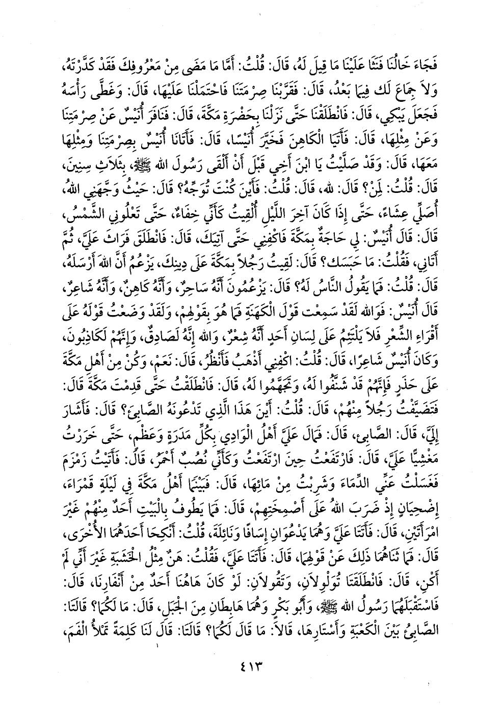 قال: فبينما أهل مكة في ليلة قمراء، إضحيان إذ ضرب الله على أصمختهم، قال: فما يطوف بالبيت أحد منهم غير امرأتين، قال: فأتتا علي وهما يدعوان إسافا ونائلة، قلت: أنكحا أحدهما الأخرى، قال: فما ثناهما ذلك عن قولهما، قال: فأتتا علي، فقلت: هن مثل الخشبة غير أني لم أكن، قال: فانطلقتا تولولان، وتقولان: لو كان هاهنا أحد من أنفارنا، قال: فاستقبلهما رسول الله صَلى الله عَليه وسَلم وأَبو بكر وهما هابطان من الجبل، قال: ما لكما؟ قالتا: الصابئ بين الكعبة وأستارها، قالا: ما قال لكما؟ قالتا: قال لنا كلمة تملأ الفم،