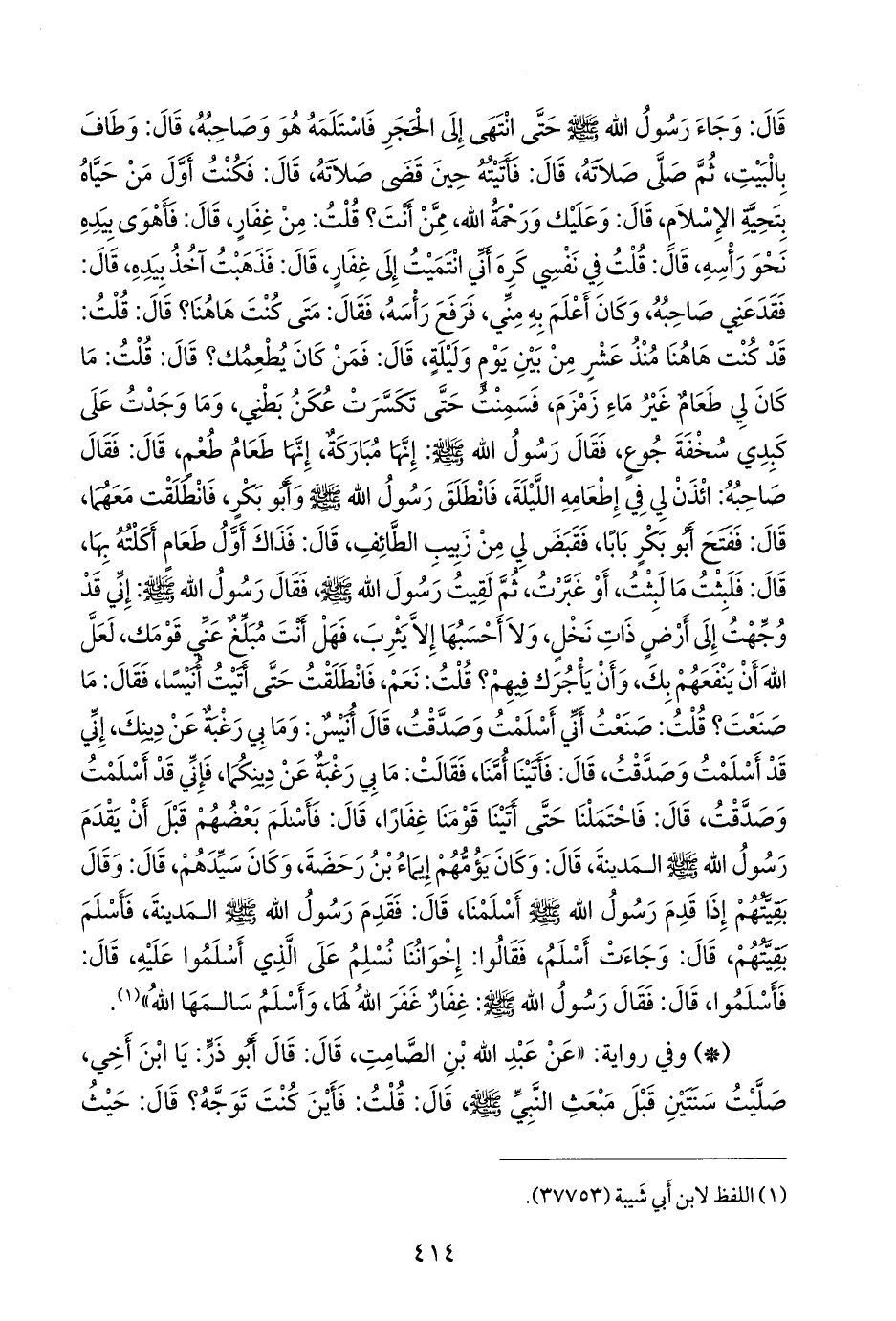 وجهني الله ... واقتص الحديث بنحو حديث سليمان بن المغيرة، وقال في الحديث: فتنافرا إلى رجل من الكهان، قال: فلم يزل أخي أنيس يمدحه حتى غلبه، قال: فأخذنا صرمته فضممناها إلى صرمتنا، وقال أيضا في حديثه: قال: فجاء النبي صَلى الله عَليه وسَلم فطاف بالبيت، وصلى ركعتين خلف المقام، قال: فأتيته، فإني لأول الناس حياه بتحية الإسلام، قال: قلت: السلام عليك يا رسول الله، قال: وعليك السلام، من أنت؟ وفي حديثه أيضا: فقال: منذ كم أنت هاهنا؟ قال: قلت: منذ خمس عشرة، وفيه: فقال أَبو بكر: أتحفني بضيافته الليلة» (¬٢).