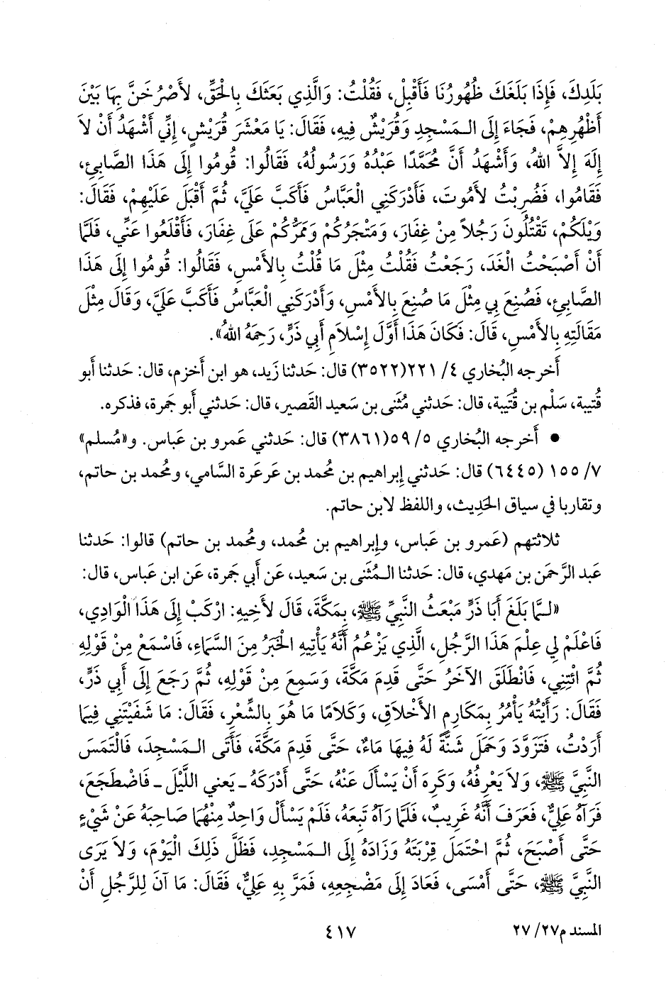 فقالوا: قوموا إلى هذا الصابئ, فقاموا, فضربت لأموت, فأدركني العباس فأكب علي, ثم أقبل عليهم، فقال: ويلكم, تقتلون رجلا من غفار، ومتجركم وممركم على غفار, فأقلعوا عني، فلما أن أصبحت الغد، رجعت فقلت مثل ما قلت بالأمس، فقالوا: قوموا إلى هذا الصابئ, فصنع بي مثل ما صنع بالأمس, وأدركني العباس فأكب علي، وقال مثل مقالته بالأمس, قال: فكان هذا أول إسلام أبي ذر، رحمه الله».
