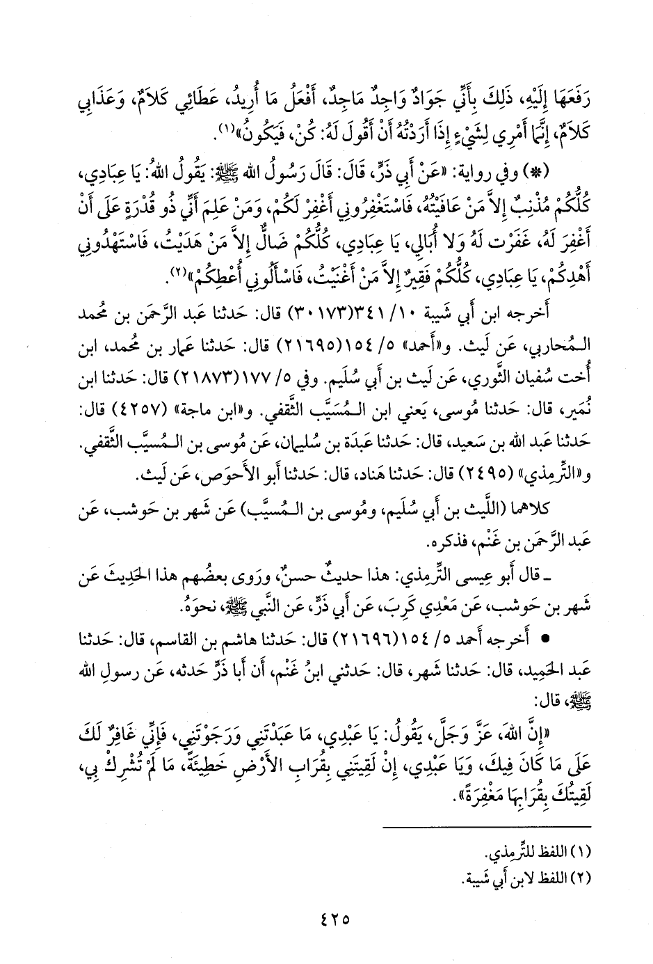 - وفي رواية: «عن أبي ذر، قال: قال رسول الله صَلى الله عَليه وسَلم: يقول الله: يا عبادي، كلكم مذنب إلا من عافيته، فاستغفروني أغفر لكم، ومن علم أني ذو قدرة على أن أغفر له، غفرت له ولا أبالي، يا عبادي، كلكم ضال إلا من هديت، فاستهدوني أهدكم، يا عبادي، كلكم فقير إلا من أغنيت، فاسألوني أعطكم» (¬١).