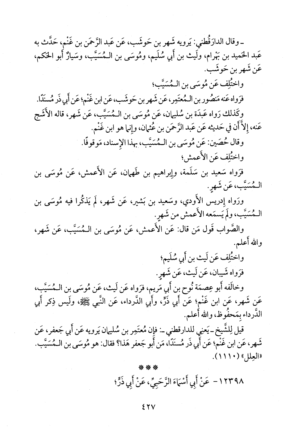ورواه إدريس الأَوْدي، وسعيد بن بشير، عن شهر، لم يذكرا فيه موسى بن المُسَيب، ولم يسمعه الأعمش من شهر.