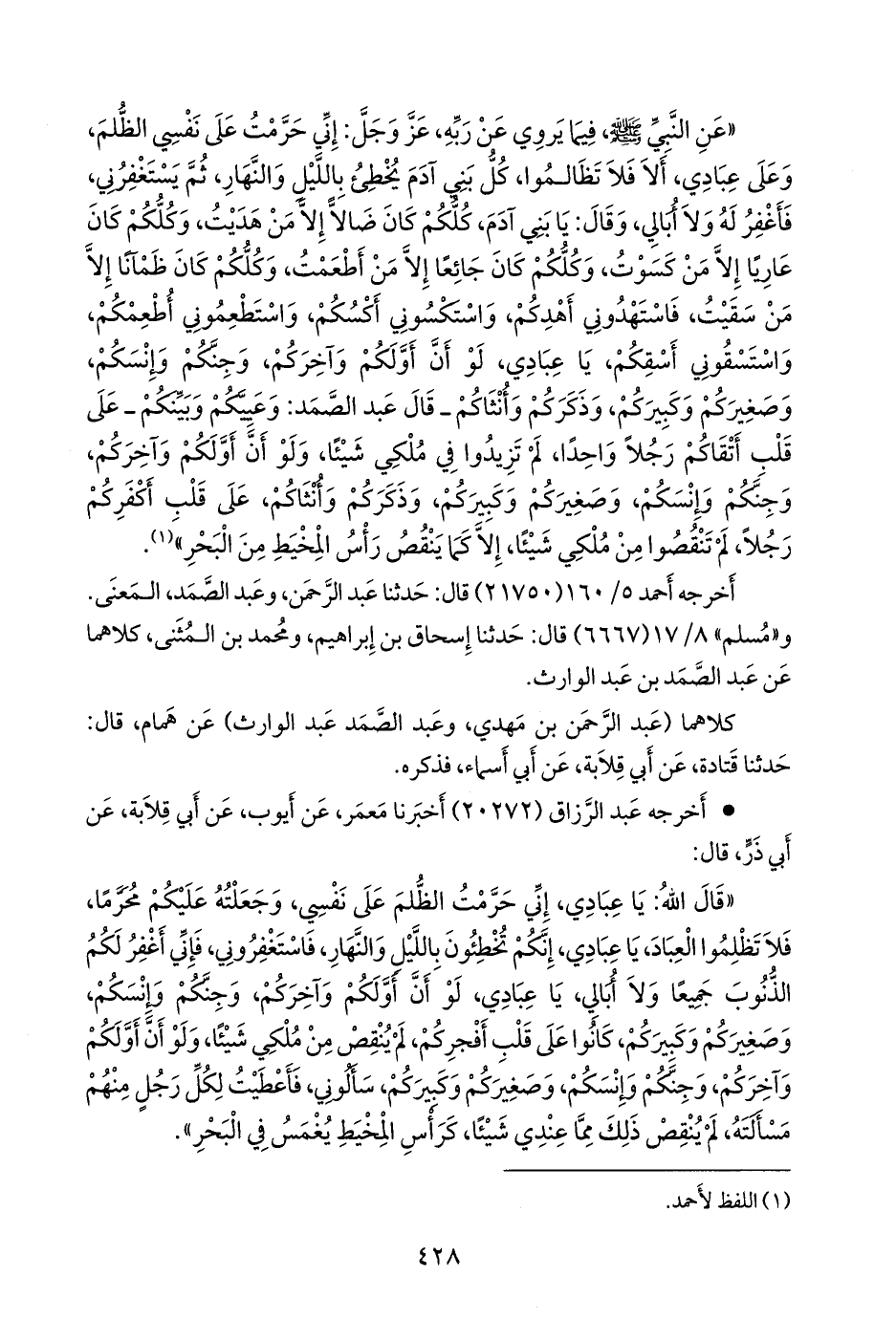 «قال الله: يا عبادي، إني حرمت الظلم على نفسي، وجعلته عليكم محرما، فلا تظلموا العباد، يا عبادي، إنكم تخطئون بالليل والنهار، فاستغفروني، فإني أغفر لكم الذنوب جميعا ولا أبالي، يا عبادي، لو أن أولكم وآخركم، وجنكم وإنسكم، وصغيركم وكبيركم، كانوا على قلب أفجركم، لم ينقص من ملكي شيئا، ولو أن أولكم وآخركم، وجنكم وإنسكم، وصغيركم وكبيركم، سألوني، فأعطيت لكل رجل منهم مسألته، لم ينقص ذلك مما عندي شيئا، كرأس المخيط يغمس في البحر»