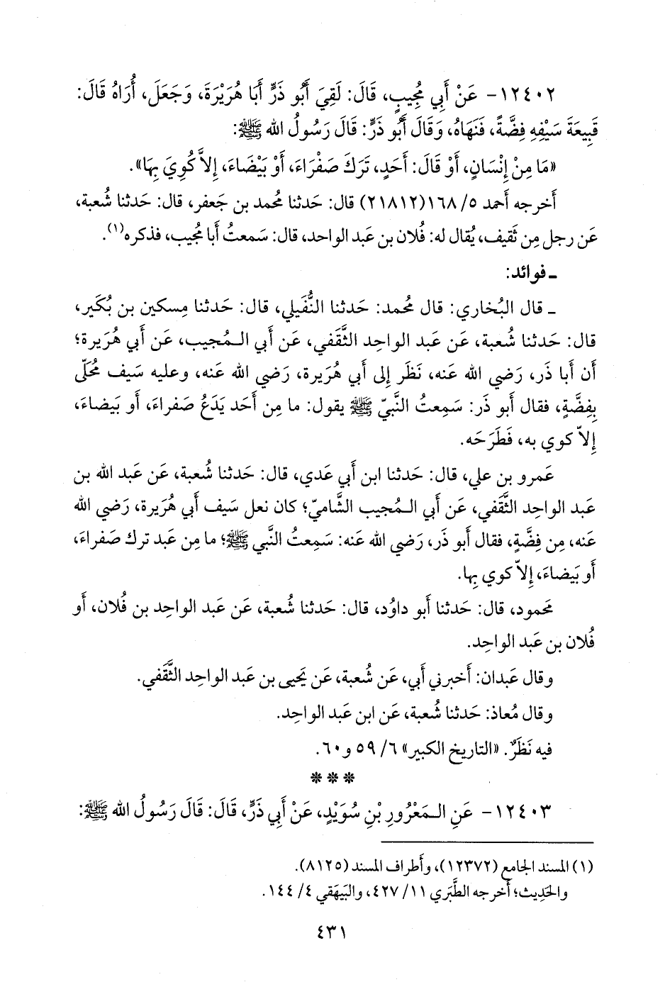 - قال البخاري: قال محمد: حدثنا النفيلي، قال: حدثنا مسكين بن بكير، قال: حدثنا شعبة، عن عبد الواحد الثقفي، عن أبي المجيب، عن أبي هريرة؛ أن أبا ذر، رضي الله عنه، نظر إلى أبي هريرة، رضي الله عنه، وعليه سيف محلى بفضة، فقال أَبو ذر: سمعت النبي صَلى الله عَليه وسَلم يقول: ما من أحد يدع صفراء، أو بيضاء، إلا كوي به، فطرحه.