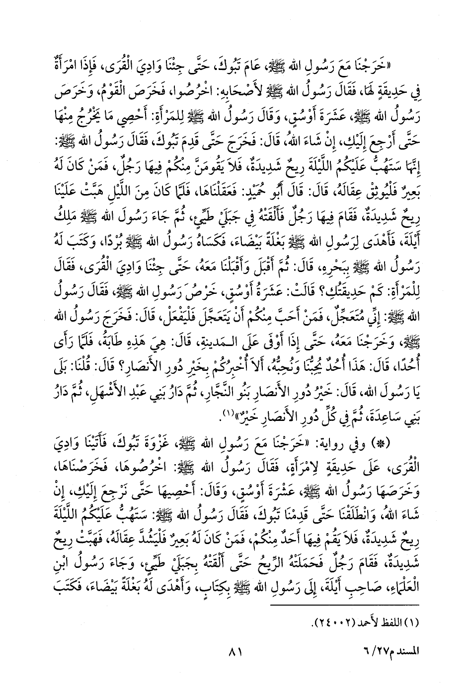 - وفي رواية: «خرجنا مع رسول الله صَلى الله عَليه وسَلم غزوة تبوك، فأتينا وادي القرى، على حديقة لامرأة، فقال رسول الله صَلى الله عَليه وسَلم: اخرصوها، فخرصناها، وخرصها رسول الله صَلى الله عَليه وسَلم عشرة أوسق، وقال: أحصيها حتى نرجع إليك، إن شاء الله، وانطلقنا حتى قدمنا تبوك، فقال رسول الله صَلى الله عَليه وسَلم: ستهب عليكم الليلة ريح شديدة، فلا يقم فيها أحد منكم، فمن كان له بعير فليشد عقاله، فهبت ريح شديدة، فقام رجل فحملته الريح حتى ألقته بجبلي طيئ، وجاء رسول ابن العلماء، صاحب أيلة، إلى رسول الله صَلى الله عَليه وسَلم بكتاب، وأهدى له بغلة بيضاء، فكتب