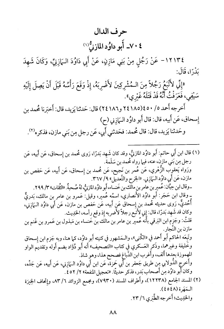 (¬١) قال ابن أبي حاتم: أَبو داود المازني، وقد كان شهد بَدرًا، روى محمد بن إسحاق، عن أبيه، عن رجل من بني مازن، عنه، فيما رواه محمد بن سلمة، ورواه يعقوب الزُّهْري، عن عمر بن نجيح، عن محمد بن إسحاق، عن أبيه، عن حفص بن مازن، عن أبي داود المازني. «الجرح والتعديل» ٩/ ٣٦٧، وقال ابن حبان: عمير بن عامر بن مالك بن خنساء، أَبو داود المازني، له صحبة. «الثقات» ٣/ ٢٩٩، وقال ابن حجر: أَبو داود الأَنصاري، اسمه عمير، وقيل: عَمرو بن عامر بن مالك، بدري أحدي، روى حديثه محمد بن إسحاق عن أبيه، عن حفص بن مازن، عن أبي داود المازني، وكان قد شهد بَدرًا، قال: إني لأتبع رجلا لأضربه إذ وقع رأسه، الحديث، قلت: وجزم ابن البرقي بأنه عمير بن عامر بن مالك بن خنساء بن مبذول بن عَمرو بن غنم بن مازن بن النجار، وتبعه الحاكم أَبو أحمد في «الكنى»، والمشهور في كنيته أَبو داود، كما هنا، وبه جزم ابن إسحاق وخليفة وغيرهما، وذكر العسكري في كتاب «التصحيف» أنه أَبو دؤاد بضم أوله وتقديم الواو المهموزة بعدها ألف، وأغرب ابن الدباغ فصحح هذا، وهو شاذ، وأخرج الدولابي من طريق جعفر بن أبي حمزة، عن ابن أبي داود المازني، عن أبيه، عن جَدِّه، وكان أَبو داود من أصحاب بدر، فذكر حديثا. «تعجيل المنفعة» ٢/ ٤٥٢.