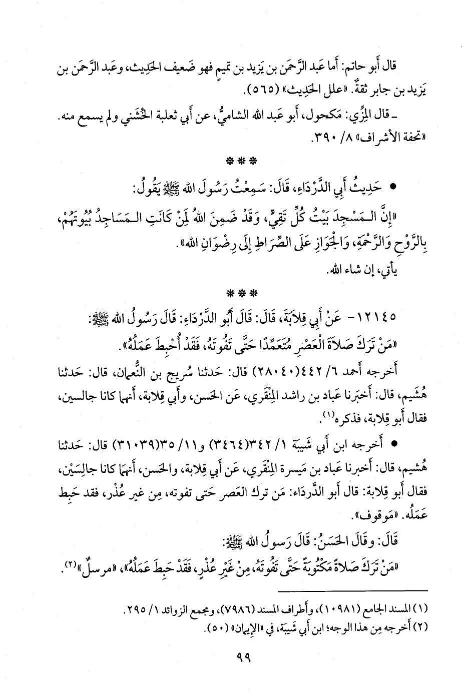 • أخرجه ابن أبي شيبة (٣٤٦٤) و ١١/ ٣٥ (٣١٠٣٩) قال: حدثنا هُشيم، قال: أخبرنا عباد بن ميسرة المنقري، عن أبي قلابة، والحسن، أنهما كانا جالسين، فقال أَبو قلابة: قال أَبو الدرداء: من ترك العصر حتى تفوته، من غير عذر، فقد حبط عمله. «موقوف».
