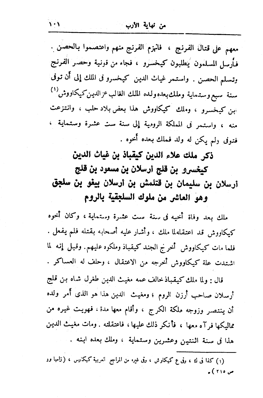 فأرسل المسلمون يطلبون كيخسرو، فجاء من قونية وحصر الفرنج وتسلم الحصن. واستمر غياث الدين كيخسرو فى الملك إلى أن توفى سنة سبع وستماية وملك بعده ولده الملك الغالب عز الدين كيكاووش «1» بن كيخسرو، وملك كيكاووش هذا بعض بلاد حلب، وانتزعت منه، واستمر فى المملكة الرومية إلى سنة ست عشرة وستماية، فتوفى ولم يكن له ولد فملك بعده أخوه.