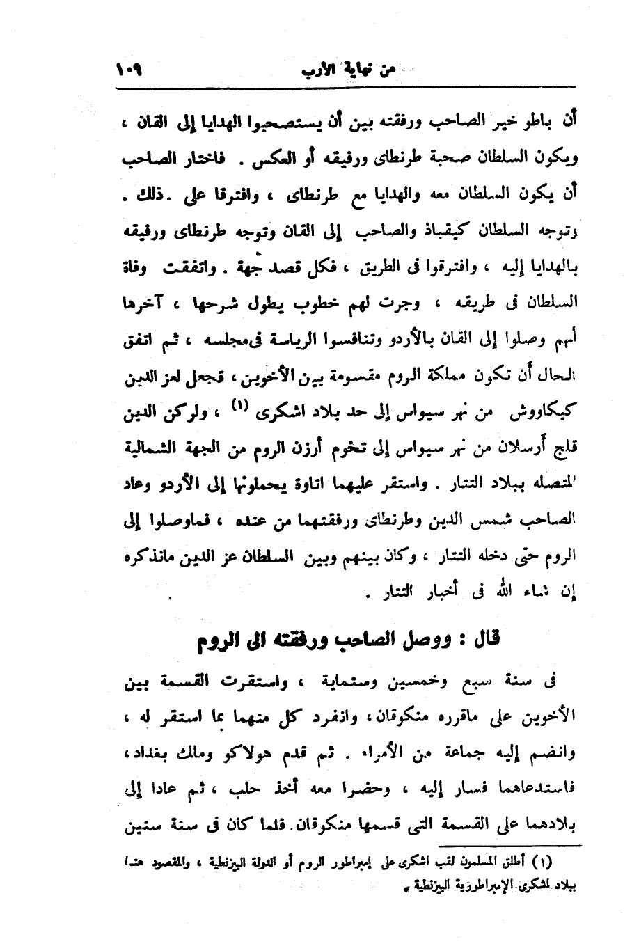 وتوجه السلطان كيقباذ والصاحب إلى القان وتوجه طرنطاى ورفيقه بالهدايا إليه، وافترقوا فى الطريق، فكل قصد جهة. واتفقت وفاة السلطان فى طريقه، وجرت لهم خطوب يطول شرحها، آخرها أنهم وصلوا إلى القان بالأردو وتنافسوا الرياسة فى مجلسه، ثم اتفق الحال أن تكون مملكة الروم مقسومة بين الأخوين، فجعل لعز الدين كيكاووش من نهر سيواس إلى حد بلاد اشكرى «1» ، ولركن الدين قلج أرسلان من نهر سيواس إلى تخوم أرزن الروم من الجهة الشمالية المتصله ببلاد التتار. واستقر عليهما اتاوة يحملونها إلى الأردو وعاد الصاحب شمس الدين وطرنطاى ورفقتهما من عنده، فما وصلوا إلى الروم حتى دخله التتار، وكان بينهم وبين السلطان عز الدين ما نذكره إن شاء الله فى أخبار التتار.