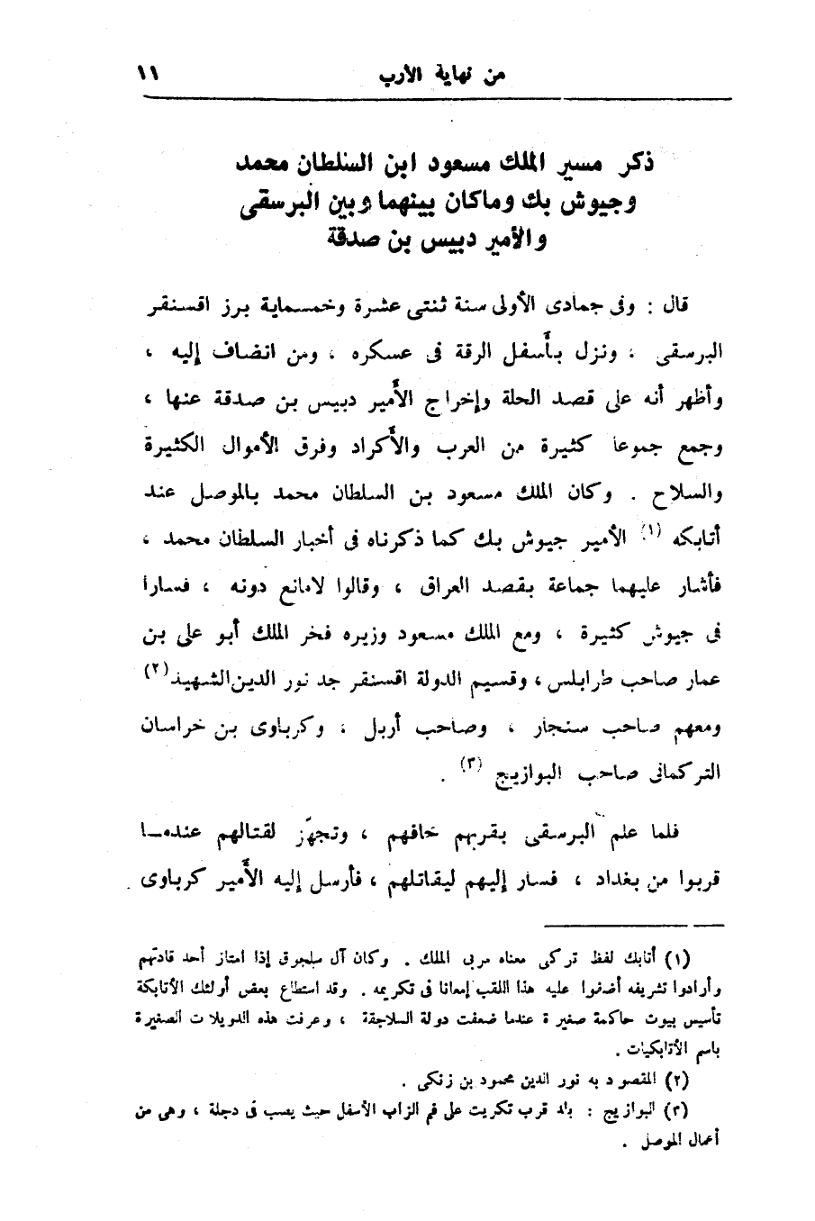 قال: وفى جمادى الأولى سنة ثنتى عشرة وخمسماية برز اقسنقر البرسقى، ونزل بأسفل الرقة فى عسكره، ومن انضاف إليه، وأظهر أنه على قصد الحلة وإخراج الأمير دبيس بن صدقة عنها، وجمع جموعا كثيرة من العرب والأكراد وفرق الأموال الكثيرة والسلاح. وكان الملك مسعود بن السلطان محمد بالموصل عند أتابكه «1» الأمير جيوش بك كما ذكرناه فى أخبار السلطان محمد، فأشار عليهما جماعة بقصد العراق، وقالوا لا مانع دونه، فسارا فى جيوش كثيرة، ومع الملك مسعود وزيره فخر الملك أبو على بن عمار صاحب طرابلس، وقسيم الدولة اقسنقر جد نور الدين الشهيد «2» ومعهم صاحب سنجار، وصاحب أربل، وكرباوى بن خراسان التركمانى صاحب البوازيج «3» .