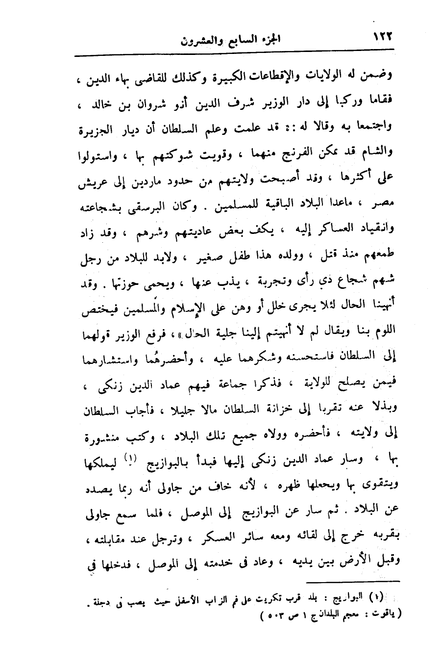 وضمن له الولايات والإقطاعات الكبيرة وكذلك للقاضى بهاء الدين، فقاما وركبا إلى دار الوزير شرف الدين أنوشروان بن خالد، واجتمعا به وقالا له: «قد علمت وعلم السلطان أن ديار الجزيرة والشام قد يمكن الفرنج منهما، وقويت شوكتهم بها، واستولوا على أكثرها، وقد أصبحت ولايتهم من حدود ماردين إلى عريش مصر، ما عدا البلاد الباقية للمسلمين. وكان البرسقى بشجاعته وانقياد العساكر إليه، يكف بعض عاديتهم وشرهم، وقد زاد طمعهم منذ قتل، وولده هذا طفل صغير، ولا بد للبلاد من رجل شهم شجاع ذى رأى وتجربة، يذب عنها، ويحمى حوزتها. وقد أنهينا الحال لئلا يجرى خلل أو وهن على الإسلام والمسلمين فيختص اللوم بنا ويقال لم لا أنهيتم إلينا جلية الحال» ، فرفع الوزير قولهما إلى السلطان فاستحسنه وشكرهما عليه، وأحضرهما واستشارهما فيمن يصلح للولاية، فذكرا جماعة فيهم عماد الدين زنكى، وبذلا عنه تقربا إلى خزانة السلطان مالا جليلا، فأجاب السلطان إلى ولايته، فأحضره وولاه جميع تلك البلاد، وكتب منشورة بها، وسار عماد الدين زنكى إليها فبدأ بالبوازيج «1» ليملكها ويتقوى بها ويجعلها ظهره، لأنه خاف من جاولى أنه ربما يصده عن البلاد. ثم سار عن البوازيج إلى الموصل، فلما سمع جاولى بقربه خرج إلى لقائه ومعه سائر العسكر، وترجل عند مقابلته، وقبل الأرض بين يديه، وعاد فى خدمته إلى الموصل، فدخلها فى
