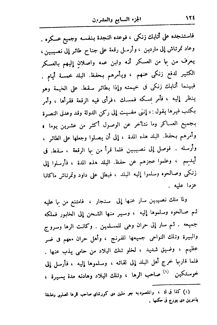ولما ملك نصيبين سار عنها إلى سنجار، فامتنع من بها عليه ثم صالحوه وسلموها إليه، وسير منها الشحن إلى الخابور فملكه جميعه. ثم سار إلى حران وهى للمسلمين. وكانت الرها وسروج والبيرة وتلك النواحى جميعها للفرنج، وأهل حران معهم فى ضر عظيم، وضيق شديد، لخلو تلك البلاد من حامى يذب عنها.