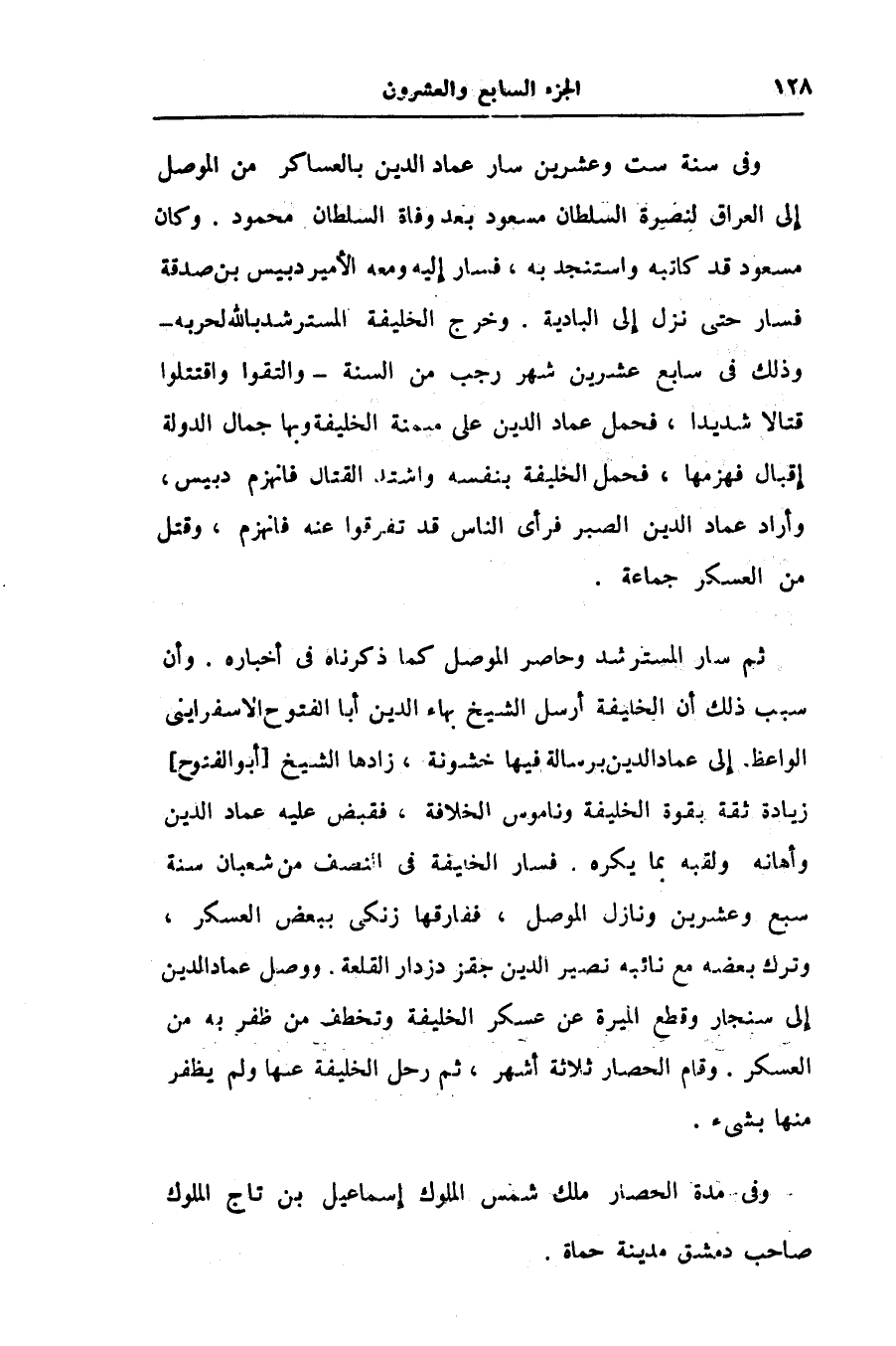 ثم سار المسترشد وحاصر الموصل كما ذكرناه فى أخباره. وأن سبب ذلك أن الخليفة أرسل الشيخ بهاء الدين أبا الفتوح الاسفراينى الواعظ إلى عماد الدين برسالة فيها خشونة، زادها الشيخ [أبو الفتوح] زيادة ثقة بقوة الخليفة وناموس الخلافة، فقبض عليه عماد الدين وأهانه ولقبه بما يكره. فسار الخليفة فى النصف من شعبان سنة سبع وعشرين ونازل الموصل، ففارقها زنكى ببعض العسكر، وترك بعضه مع نائبه نصير الدين جقز دزدار القلعة. ووصل عماد الدين إلى سنجار وقطع الميرة عن عسكر الخليفة وتخطف من ظفر به من العسكر. وقام الحصار ثلاثة أشهر، ثم رحل الخليفة عنها ولم يظفر منها بشىء.