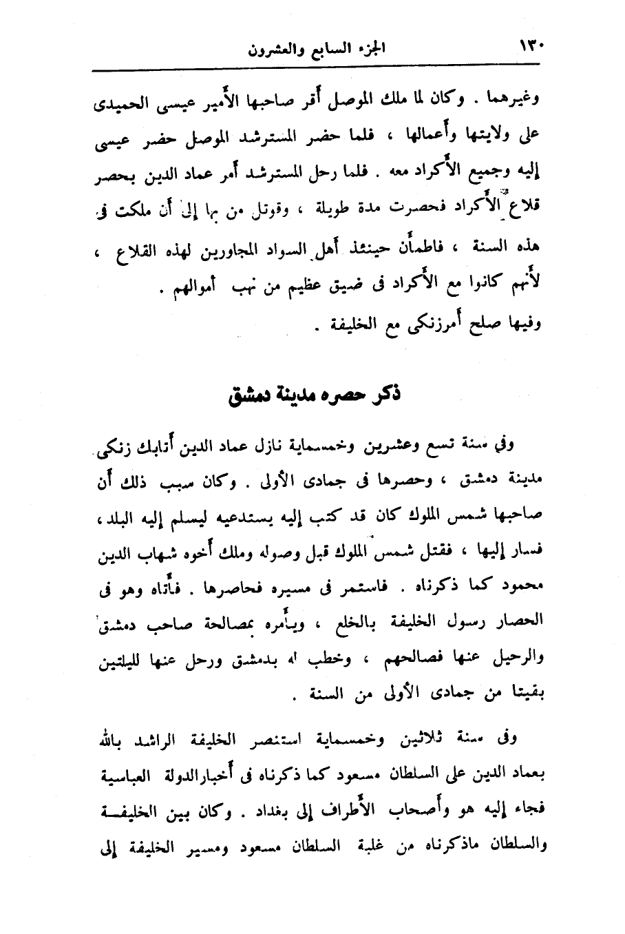 وفى سنة تسع وعشرين وخمسماية نازل عماد الدين أتابك زنكى مدينة دمشق، وحصرها فى جمادى الأولى. وكان سبب ذلك أن صاحبها شمس الملوك كان قد كتب إليه يستدعيه ليسلم إليه البلد، فسار إليها، فقتل شمس الملوك قبل وصوله وملك أخوه شهاب الدين محمود كما ذكرناه. فاستمر فى مسيره فحاصرها. فأتاه وهو فى الحصار رسول الخليفة بالخلع، ويأمره بمصالحة صاحب دمشق والرحيل عنها فصالحهم، وخطب له بدمشق ورحل عنها لليلتين بقيتا من جمادى الأولى من السنة.