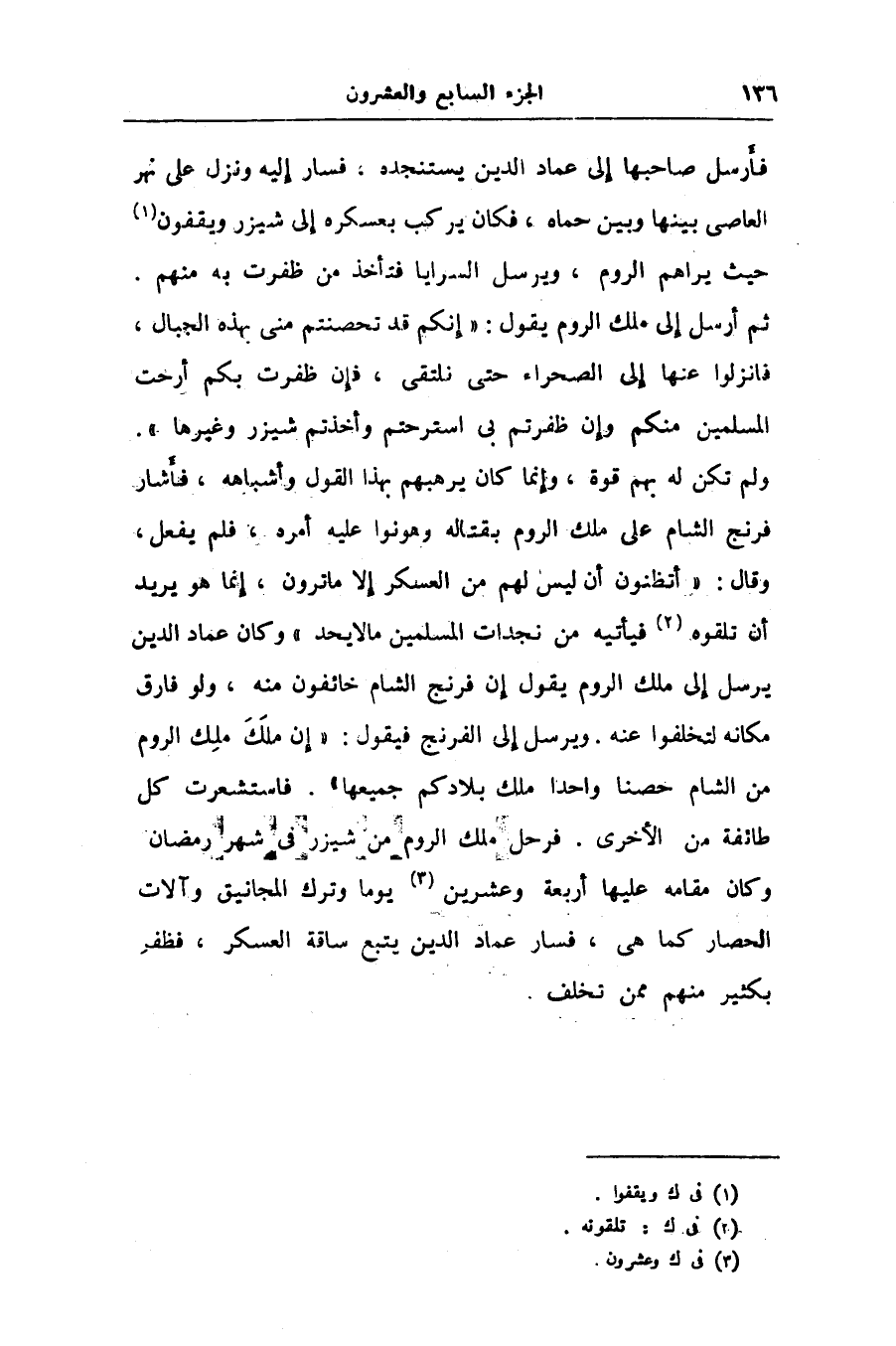 ولم تكن له بهم قوة، وإنما كان يرهبهم بهذا القول وأشباهه، فأشار فرنج الشام على ملك الروم بقتاله وهونوا عليه أمره، فلم يفعل، وقال: «أتظنون أن ليس لهم من العسكر إلا ما ترون، إنما هو يريد أن تلقوه «2» فيأتيه من نجدات المسلمين ما لا يحد» وكان عماد الدين يرسل إلى ملك الروم يقول إن فرنج الشام خائفون منه، ولو فارق مكانه لتخلفوا عنه. ويرسل إلى الفرنج فيقول: «إن ملك ملك الروم من الشام حصنا واحدا ملك بلادكم جميعها» . فاستشعرت كل طائفة من الأخرى. فرحل ملك الروم من شيزر فى شهر رمضان وكان مقامه عليها أربعة وعشرين «3» يوما وترك المجانيق وآلات الحصار كما هى، فسار عماد الدين يتبع ساقة العسكر، فظفر بكثير منهم ممن تخلف.