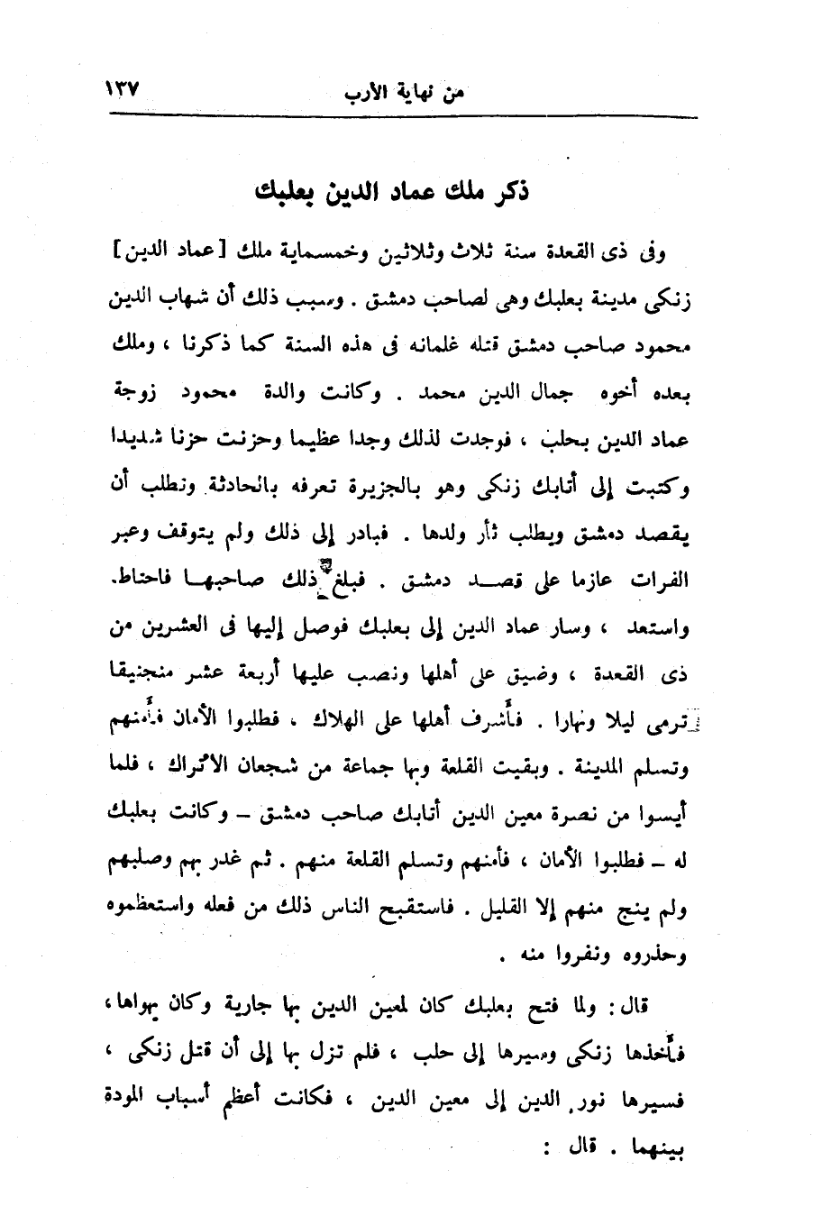 وفى ذى القعدة سنة ثلاث وثلاثين وخمسماية ملك [عماد الدين] زنكى مدينة بعلبك وهى لصاحب دمشق. وسبب ذلك أن شهاب الدين محمود صاحب دمشق قتله غلمانه فى هذه السنة كما ذكرنا، وملك بعده أخوه جمال الدين محمد. وكانت والدة محمود زوجة عماد الدين بحلب، فوجدت لذلك وجدا عظيما وحزنت حزنا شديدا وكتبت إلى أتابك زنكى وهو بالجزيرة تعرفه بالحادثة وتطلب أن يقصد دمشق ويطلب ثأر ولدها. فبادر إلى ذلك ولم يتوقف وعبر الفرات عازما على قصد دمشق. فبلغ ذلك صاحبها فاحتاط واستعد، وسار عماد الدين إلى بعلبك فوصل إليها فى العشرين من ذى القعدة، وضيق على أهلها ونصب عليها أربعة عشر منجنيقا ترمى ليلا ونهارا. فأشرف أهلها على الهلاك، فطلبوا الأمان فأمنهم وتسلم المدينة. وبقيت القلعة وبها جماعة من شجعان الأتراك، فلما أيسوا من نصرة معين الدين أتابك صاحب دمشق- وكانت بعلبك له- فطلبوا الأمان، فأمنهم وتسلم القلعة منهم. ثم غدر بهم وصلبهم ولم ينج منهم إلا القليل. فاستقبح الناس ذلك من فعله واستعظموه وحذروه ونفروا منه.
