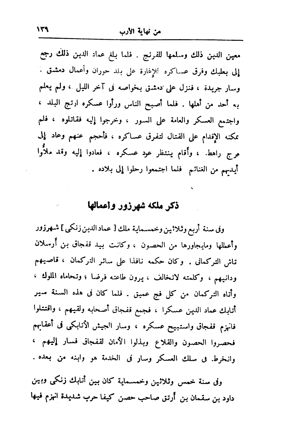 وفى سنة أربع وثلاثين وخمسماية ملك [عماد الدين زنكى] شهرزور وأعمالها وما يجاورها من الحصون، وكانت بيد قفجاق بن أرسلان تاش التركمانى. وكان حكمه نافذا على سائر التركمان، قاصيهم ودانيهم، وكلمته لا تخالف، يرون طاعته فرضا؛ وتحاماه الملوك، وأتاه التركمان من كل فج عميق. فلما كان فى هذه السنة سير أتابك عماد الدين عسكرا، فجمع قفجاق أصحابه ولقيهم، واقتتلوا فانهزم قفجاق واستبيح عسكره، وسار الجيش الأتابكى فى أعقابهم فحصروا الحصون والقلاع وبذلوا الأمان لقفجاق فسار إليهم، وانخرط فى سلك العسكر وسار فى الخدمة هو وابنه من بعده.