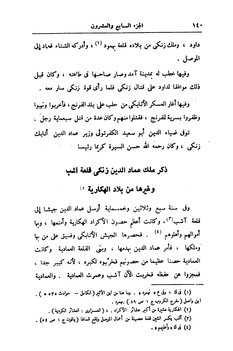 وفى سنة سبع وثلاثين وخمسماية أرسل عماد الدين جيشا إلى قلعة آشب «3» ، وكانت أعظم حصون الأكراد الهكارية وأمنعها، وبها أموالهم وأهلوهم»