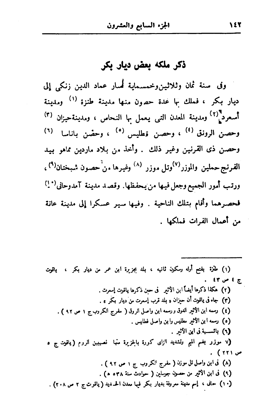 وفى سنة ثمان وثلاثين وخمسماية سار عماد الدين زنكى إلى ديار بكر، فملك بها عدة حصون منها مدينة طنزة «1» ومدينة أسعرد «2» ومدينة المعدن التى يعمل بها النحاس، ومدينة حيزان «3» وحصن الرونق «4» ، وحصن قطليس «5» ، وحصن باناسا «6» وحصن ذى القرنين وغير ذلك. وأخذ من بلاد ماردين مما هو بيد الفرنج حملين والموزر «7» وتل موزر «8» وغيرها من حصون شبختان «9» ، ورتب أمور الجميع وجعل فيها من يحفظها. وقصد مدينة آمد وحانى. «10»