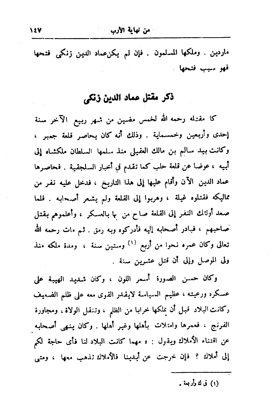 كا مقتله رحمه الله لخمس مضين من شهر ربيع الآخر سنة إحدى وأربعين وخمسماية. وذلك أنه كان يحاصر قلعة جعبر، وكانت بيد سالم بن مالك العقيلى منذ سلمها السلطان ملكشاه إلى أبيه، عوضا عن قلعة حلب كما تقدم فى أخبار السلجقية. فحاصرها عماد الدين الآن وأقام عليها إلى هذا التاريخ، فدخل عليه نفر من مماليكه فقتلوه غيلة، وهربوا إلى القلعة ولم يشعر أصحابه. فلما صعد أولئك النفر إلى القلعة صاح من بها بالعسكر، وأعلموهم بقتل صاحبهم، فبادر أصحابه إليه فأدركوه وبه رمق. ثم مات رحمه الله تعالى وكان عمره نحوا من أربع «1» وستين سنة، ومدة ملكه منذ ولى الموصل وإلى أن قتل عشرين سنة.