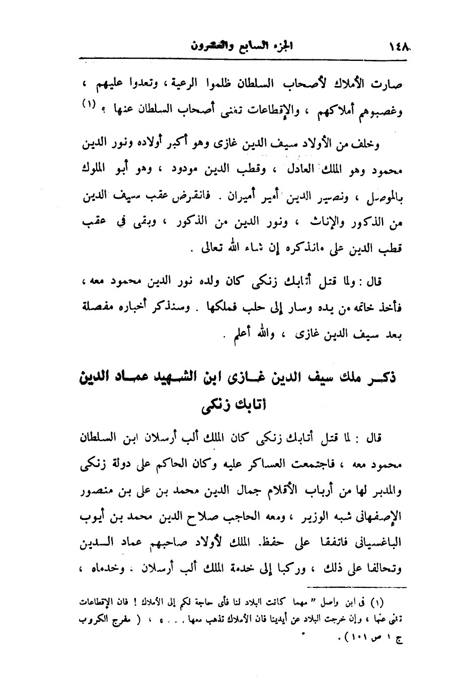 صارت الأملاك لأصحاب السلطان ظلموا الرعية، وتعدوا عليهم، وغصبوهم أملاكهم، والإقطاعات تفنى أصحاب السلطان عنها» «1» وخلف من الأولاد سيف الدين غازى وهو أكبر أولاده ونور الدين محمود وهو الملك العادل، وقطب الدين مودود، وهو أبو الملوك بالموصل، ونصير الدين أمير أميران. فانقرض عقب سيف الدين من الذكور والإناث، ونور الدين من الذكور، وبقى فى عقب قطب الدين على ما نذكره إن شاء الله تعالى.