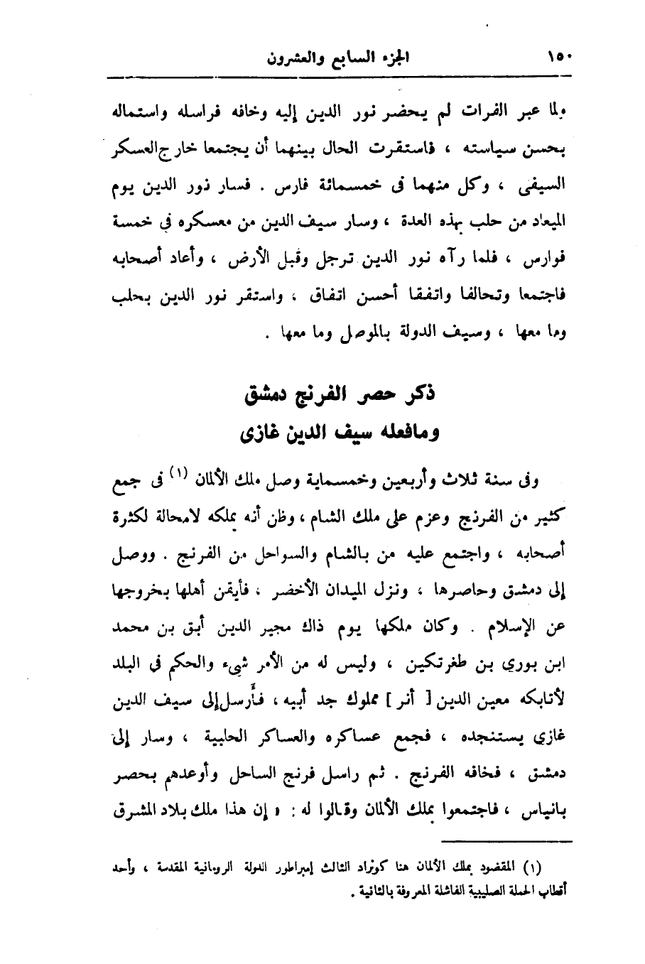 وفى سنة ثلاث وأربعين وخمسماية وصل ملك الألمان «1» فى جمع كثير من الفرنج وعزم على ملك الشام، وظن أنه يملكه لا محالة لكثرة أصحابه، واجتمع عليه من بالشام والسواحل من الفرنج. ووصل إلى دمشق وحاصرها، ونزل الميدان الأخضر، فأيقن أهلها بخروجها عن الإسلام. وكان ملكها يوم ذاك مجير الدين أبق بن محمد ابن بورى بن طغرتكين، وليس له من الأمر شىء والحكم فى البلد لأتابكه معين الدين [أنر] مملوك جد أبيه، فأرسل إلى سيف الدين غازى يستنجده، فجمع عساكره والعساكر الحلبية، وسار إلى دمشق، فخافه الفرنج. ثم راسل فرنج الساحل وأوعدهم بحصر بانياس، فاجتمعوا بملك الألمان وقالوا له: «إن هذا ملك بلاد المشرق
