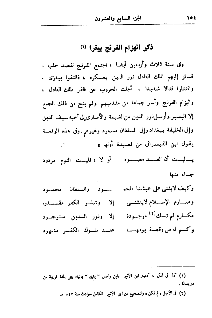 فسار إليهم الملك العادل نور الدين بعسكره، فالتقوا بيغزى، واقتتلوا قتالا شديدا، أجلت الحروب عن ظفر الملك العادل، وانهزام الفرنج وأسر جماعة من مقدميهم. ولم ينج من ذلك الجمع إلا اليسير. وأرسل نور الدين من الغنيمة والأسارى إلى أخيه سيف الدين وإلى الخليفة ببغداد وإلى السلطان مسعود وغيرهم. وفى هذه الوقعة يقول ابن القيسرانى من قصيدة أولها.