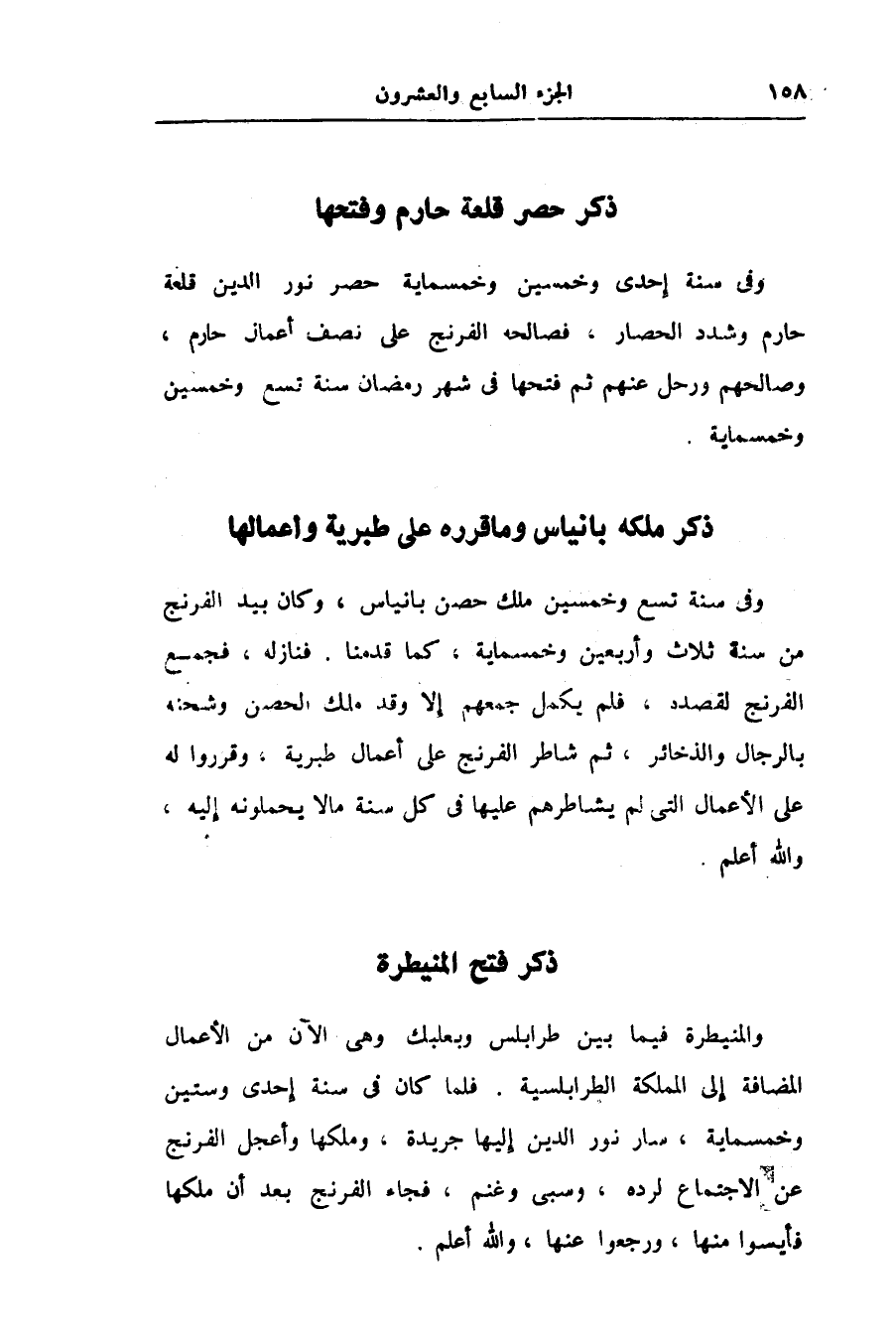 وفى سنة تسع وخمسين ملك حصن بانياس، وكان بيد الفرنج من سنة ثلاث وأربعين وخمسماية، كما قدمنا. فنازله، فجمع الفرنج لقصده، فلم يكمل جمعهم إلا وقد ملك الحصن وشحنه بالرجال والذخائر، ثم شاطر الفرنج على أعمال طبرية، وقرروا له على الأعمال التى لم يشاطرهم عليها فى كل سنة ما لا يحملونه إليه، والله أعلم.