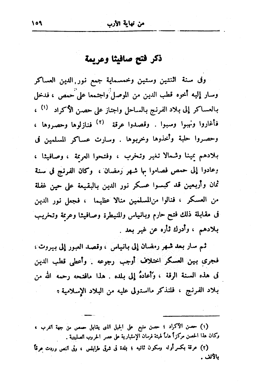 وفى سنة اثنتين وستين وخمسماية جمع نور الدين العساكر وسار إليه أخوه قطب الدين من الموصل واجتمعا على حمص، فدخل بالعساكر إلى بلاد الفرنج بالساحل واجتاز على حصن الأكراد «1» ، فأغاروا ونهبوا وسبوا. وقصدوا عرقة «2» فنازلوها وحصروها، وحصروا حلبة وأخذوها وخربوها. وسارت عساكر المسلمين فى بلادهم يمينا وشمالا تغير وتخرب، وفتحوا العريمة، وصافيثا، وعادوا إلى حمص فصاموا بها شهر رمضان، وكان الفرنج فى سنة ثمان وأربعين قد كبسوا عسكر نور الدين بالبقيعة على حين غفلة من العسكر، فنالوا من المسلمين منالا عظيما، فجعل نور الدين فى مقابلة ذلك فتح حارم وبانياس والمنيطرة وصافيثا وعريمة وتخريب بلادهم، وأدرك ثأره عن غير بعد.
